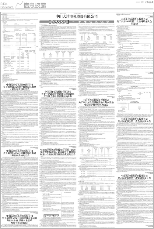 中山大洋电机股份有限公司(以下简称“公司”)于2022年8月19日召开第六届董事会第二次会议和第六届监事会第二次会议,审议通过了《关于调整公司2020年股票期权激励计划行权价格的议案》。公司为进一步完善公司的法人治理结构,建立、健全公司中长期激励机制,吸引和留住优秀管理人才、核心技术(业务)骨干,于2020年5月份推出《中山大洋电机股份有限公司2020年股票期权激励计划(草案)》(以下简称“股票期权激励计划”),并分别于2020年7月14日和2021年5月11日完成股票期权激励计划的首次授予和预留部分授予登记。鉴于公司在股票期权激励计划行权等待期期间,实施了2020年度、2021年半年度和2021年度的权益分派方案,根据股票期权激励计划的相关规定,现对股票期权激励计划中首次授予和预留部分授予的股票期权行权价格进行调整,有关事项说明如下: