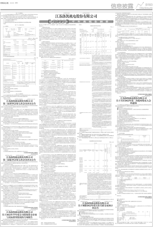 根据中国证券监督管理委员会《上市公司监管指引第2号—上市公司募集资金管理和使用的监管要求(2022年修订)》(证监会公告[2022]15号)及《上海证券交易所上市公司自律监管指引第1号——规范运作》(上证发[2022]2号)的规定,现将江苏洛凯机电股份有限公司(以下简称“公司”或“洛凯股份”)截至 2022年6月30日募集资金存放及使用情况报告如下: