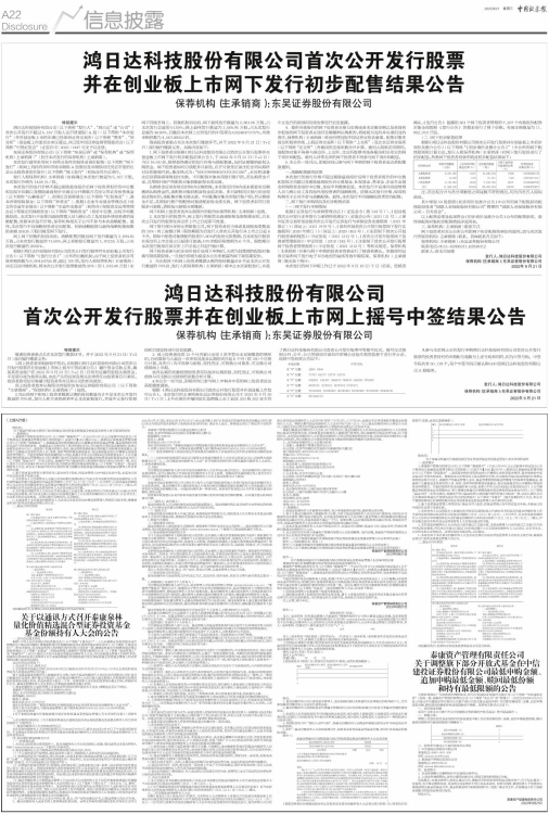 根据《鸿日达科技股份有限公司首次公开发行股票并在创业板上市发行公告》,本次发行的主承销商东吴证券股份有限公司于2022年9月20日(T+1日)上午在深圳市福田区红荔西路上步工业区203栋202室主持了鸿日达科技股份有限公司首次公开发行股票中签摇号仪式。摇号仪式按照公开、公平、公正的原则在深圳市罗湖公证处代表的监督下进行并公证。现将中签结果公告如下: