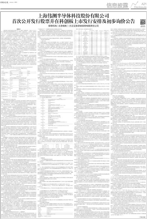 8、投资风险特别公告:初步询价结束后,发行人和主承销商确定的发行价格超过网下投资者剔除最高报价部分后剩余报价的中位数和加权平均数,以及公募产品、社保基金和养老金剩余报价的中位数和加权平均数的孰低值的,将在申购前发布的《上海伟测半导体科技股份有限公司首次公开发行股票并在科创板上市投资风险特别公告》(以下简称“《投资风险特别公告》”)中说明相关情况。
