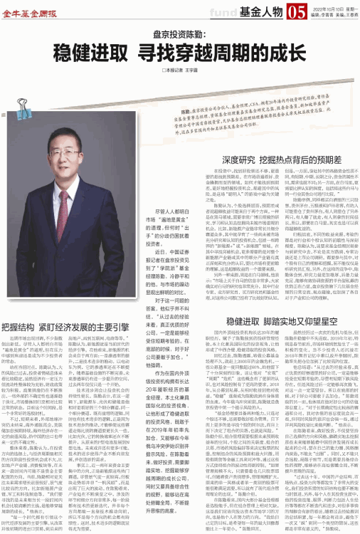 在陈勤看来,做好投资,不仅要坚持自己选择的方向和风格,脚踏实地去挖掘那些未来能够随着中国经济发展而成长起来的公司,要在自己的能力圈、风格圈内深造,不能太“出圈”。同时,又不能只会选股,局限于细节,而是需要具备综合性的视野,能够站在高处俯瞰全局,不断提升思维的高度。