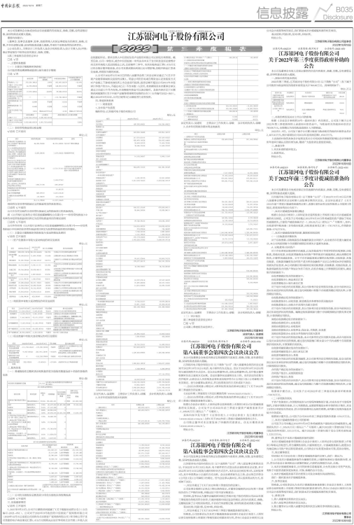 经审核,监事会认为董事会编制和审核江苏银河电子股份有限公司2022年第三季度报告的程序符合法律、行政法规和中国证监会的规定,报告内容真实、准确、完整地反映了公司的实际情况,不存在任何虚假记载、误导性陈述或者重大遗漏。