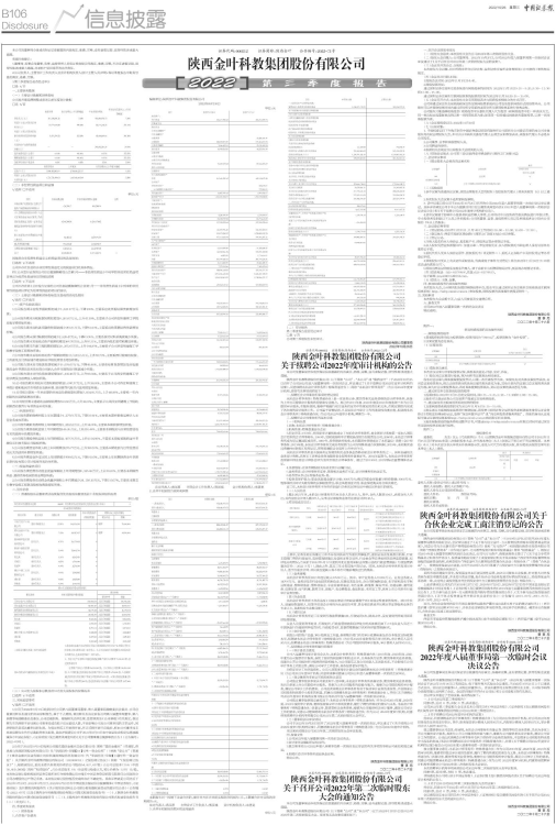 公司2022年第三季度报告全文详见本公司同日在《中国证券报》、《证券时报》及巨潮资讯网发布的《陕西金叶科教集团股份有限公司2022年第三季度报告》。