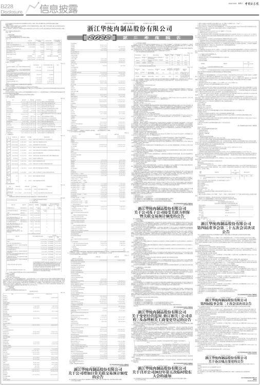 浙江华统肉制品股份有限公司(以下简称“公司”)第四届监事会第二十次会议于2022年10月21日以电子邮件、电话通讯等形式发出通知,并于2022年10月25日以现场和通讯表决相结合方式召开。本次会议应到监事3名,实际到会监事3名,其中陈科文先生采用通讯方式表决。会议由监事会主席俞志霞女士主持,会议的召集和召开符合《中华人民共和国公司法》等法律法规及公司章程的规定。