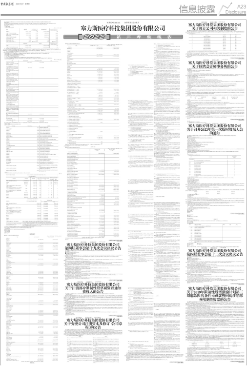 经审核,监事会认为董事会编制和审议的塞力斯医疗科技集团股份有限公司 2022年第三季度报告的程序符合法律、行政法规及中国证监会的规定,报告内容真实、准确、完整地反映了上市公司的实际情况,不存在任何虚假记载、误导性陈述或者重大遗漏。
