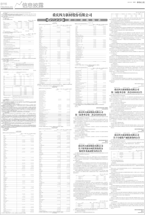 重庆四方新材股份有限公司(以下简称“公司”)第三届监事会第二次会议通知及会议资料于2022年10月21日以电子邮件或专人送达方式发出,会议于2022年10月26日以通讯表决的方式召开。应参与表决监事3名,实际表决监事3名。会议的召集、召开符合有关法律、行政法规、部门规章和《公司章程》的相关规定。会议审议并通过了如下议案: