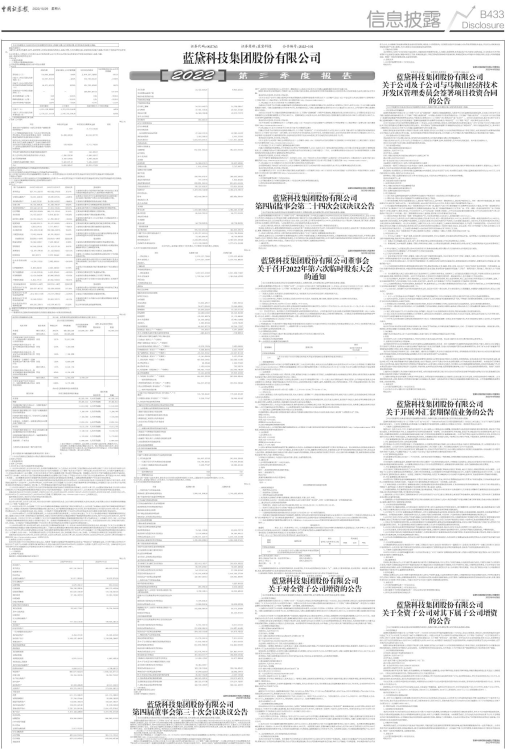 蓝黛科技集团股份有限公司(以下简称“公司”或“本公司”)第四届董事会第三十次会议通知于2022年10月25日以专人送达、电子邮件方式向公司全体董事、监事发出,会议于2022年10月28日在重庆市璧山区璧泉街道剑山路100号公司办公楼506会议室以现场结合通讯表决的方式召开。本次会议应出席董事9名,实际出席董事9名,其中出席现场会议董事7名,以通讯表决方式参会董事2名,以通讯表决方式参会的有董事廖文军先生、王鑫先生;公司监事及高级管理人员列席了会议。本次会议由董事长朱堂福先生召集并主持,会议的召集、召开与表决程序符合有关法律、法规、部门规章、规范性文件和《公司章程》等有关规定。经全体董事认真审议,本次会议以记名投票表决方式通过议案如下: