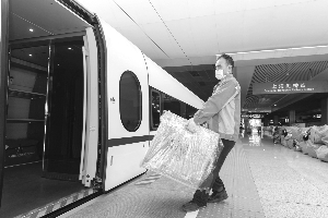 11月1日,在上海虹桥站,铁路工作人员将货物搬到G1373次列车上。