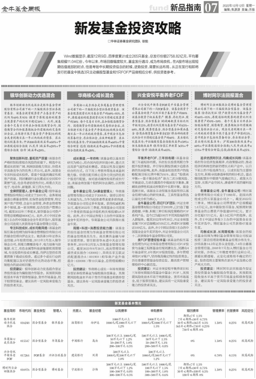 Wind数据显示,截至12月9日,四季度累计成立265只基金,总发行份额2758.82亿元,平均募集规模11.04亿份。今年以来,市场回撤幅度较大,基金发行遇冷,或为布局良机。在A股市场出现短期估值底部的时点,恰是考验中长期投资信念的时候,逆势投资,需要长远布局。从正在发行和即将发行的基金中挑选3只主动偏股型基金和1只FOF产品做相应分析,供投资者参考。