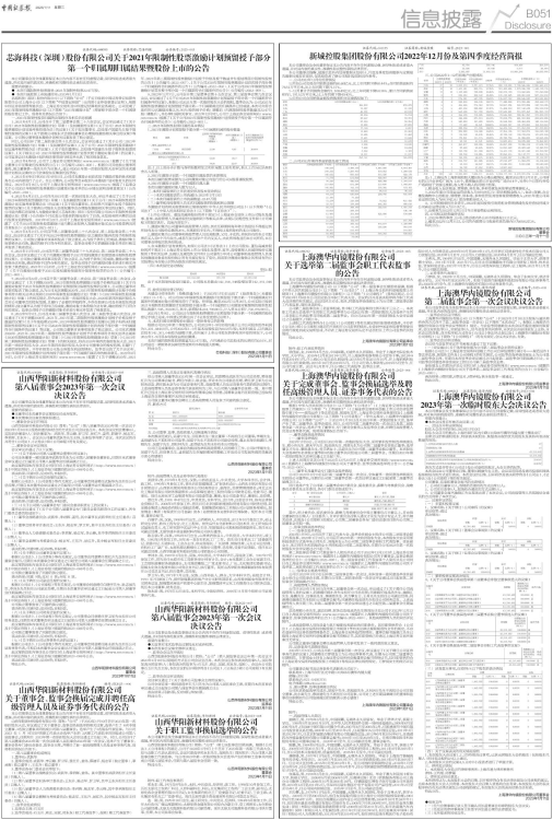 山西华阳新材料股份有限公司(简称:“公司”)第八届董事会2023年第一次会议于2023年1月10日以现场和通讯相结合的方式在公司会议室召开。本次会议应到会董事9人,实际到会董事9人(到会董事为: 武跃华、李云峰、罗卫军、景红升、姜伟、薛建平、杨志军、季君晖、王东升)。会议由公司董事武跃华先生主持,全体监事列席了会议。本次会议的召开符合《公司法》、《证券法》和《公司章程》的有关规定。