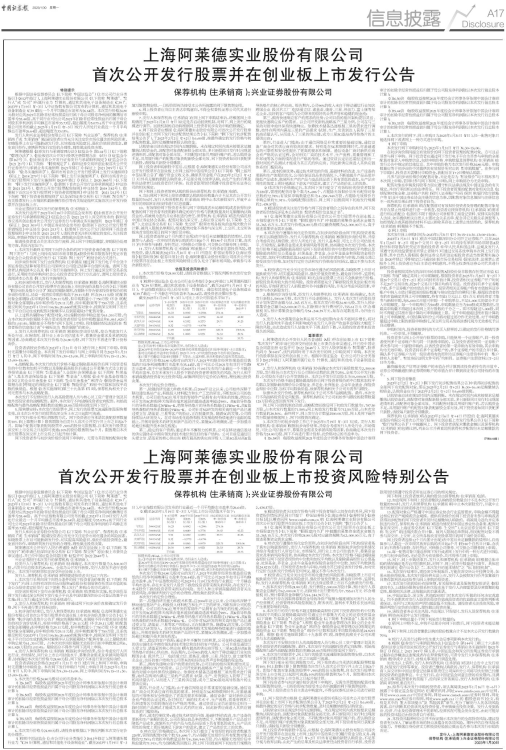 11、发行人和保荐机构(主承销商)郑重提示广大投资者注意投资风险,理性投资,请认真阅读2023年1月30日(T-1日)刊登在《中国证券报》《上海证券报》《证券时报》和《证券日报》上的《上海阿莱德实业股份有限公司首次公开发行股票并在创业板上市投资风险特别公告》,充分了解市场风险,审慎参与本次新股发行。