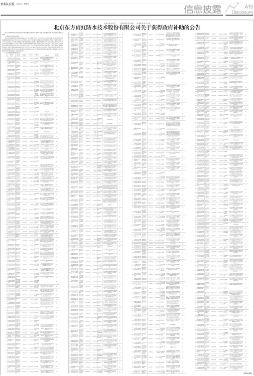 北京东方雨虹防水技术股份有限公司(以下简称“公司”)于2023年1月31日获悉,公司下属子公司获得两笔政府补助共计9,635.82元人民币,其中广东东方雨虹防水工程有限公司获得一笔政府补助1,500.00元人民币,广东东方雨虹新材料有限责任公司获得一笔政府补助8,135.82元人民币。自2022年1月1日至本公告披露日,公司及下属子公司累计获得政府补助合计529,487,000.70元人民币,其中,与收益相关的政府补助合计407,526,708.90元人民币,占公司2021年度经审计的归属于上市公司股东净利润的9.69%,与资产相关的政府补助合计121,960,291.80元人民币,占公司2021年度经审计的归属于上市公司股东净资产的0.46%,以上补助形式均为现金,与公司日常经营活动相关,截至本公告披露日,上述补助资金已经全部到账。具体明细如下: