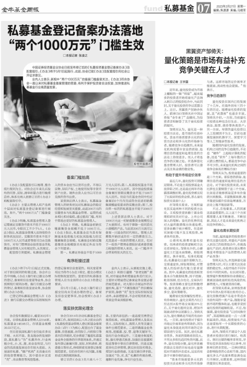 视觉中国图片中金基金耿帅军: 看好中小盘股投资机遇02基金新闻兴证全球基金童兰: 由消费迈向制造 稳步拓展能力圈05基金人物04财富视野万家基金乔亮: 做纯粹的量化产品07私募基金私募基金登记备案办法落地 “两个1000万元”门槛生效