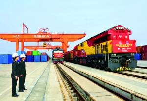 3月2日,“南昌-温州港-洛杉矶”铁海联运班列(前)准备从南昌国际陆港铁路口岸二期驶出。