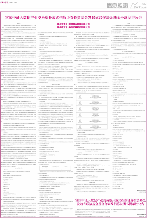 10、本公告仅对富国中证大数据产业交易型开放式指数证券投资基金发起式联接基金发售的有关事项和规定予以说明。投资者欲了解本基金的详细情况,请详细阅读同时发布在中国证监会基金电子披露网站(http://eid.csrc.gov.cn/fund)和本公司网站(www.fullgoal.com.cn)的基金合同全文和招募说明书全文,投资者亦可通过本公司网站下载基金业务申请表格和了解本基金募集相关事宜。