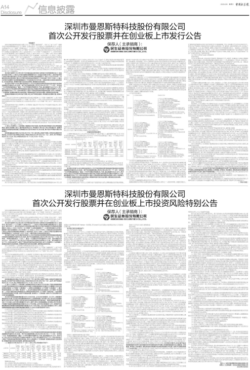 11、发行人和保荐人(主承销商)郑重提示广大投资者注意投资风险,理性投资,请认真阅读2023年4月26日(T-1日)刊登在《中国证券报》《上海证券报》《证券时报》和《证券日报》上的《深圳市曼恩斯特科技股份有限公司首次公开发行股票并在创业板上市投资风险特别公告》,充分了解市场风险,审慎参与本次新股发行。