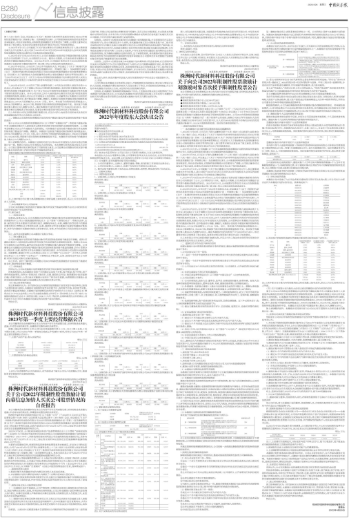 6、2023年4月25日,公司召开了2022年年度股东大会,审议通过了《关于〈株洲时代新材料科技股份有限公司2022年限制性股票激励计划(草案修订稿)〉及其摘要的议案》《关于〈株洲时代新材料科技股份有限公司2022年限制性股票激励计划实施考核管理办法〉的议案》《关于提请股东大会授权董事会办理公司股权激励计划相关事项的议案》。并于2023年4月26日公告了《关于公司2022年限制性股票激励计划内幕信息知情人买卖公司股票情况的自查报告》《株洲时代新材料科技股份有限公司2022年限制性股票激励计划》。