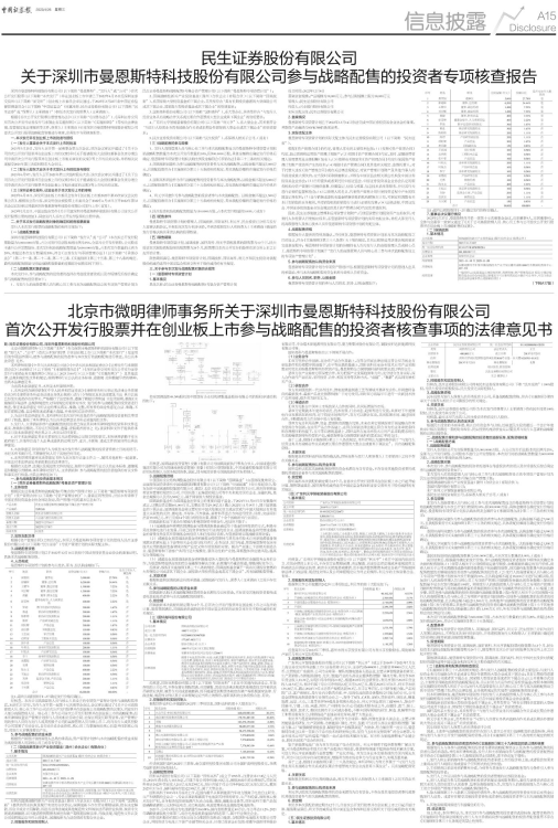 北京市微明律师所(以下简称“本所”)作为深圳市曼恩斯特科技股份有限公司(以下简称“发行人”、“公司”)首次公开发行股票 并在创业板上市(以下简称“本次发行”)见证项目的专项法律顾问,就参与战略配售的投资者参与本次发行的战略配售进行核查,并出具本法律意 见书。