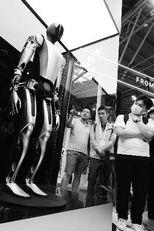 7月6日,参观者在2023世界人工智能大会展会现场的特斯拉机器人旁驻足观看。 新华社图片