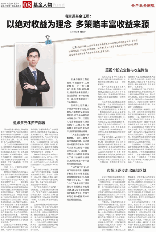 在拿到上海交通大学经济学硕士学位后,江勇加入国泰君安期货有限公司,研究商品期货对冲策略;2017年,江勇加入海富通基金量化投资部;如今,江勇来到了债券基金部下设的混合资产投资部担任基金经理。