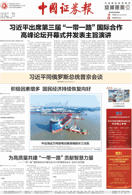 10月18日上午,国家主席习近平在人民大会堂出席第三届“一带一路”国际合作高峰论坛开幕式并发表题为《建设开放包容、互联互通、共同发展的世界》的主旨演讲。习近平宣布中国支持高质量共建“一带一路”的八项行动,强调中方愿同各方深化“一带一路”合作伙伴关系,推动共建“一带一路”进入高质量发展的新阶段,为实现世界各国的现代化作出不懈努力。