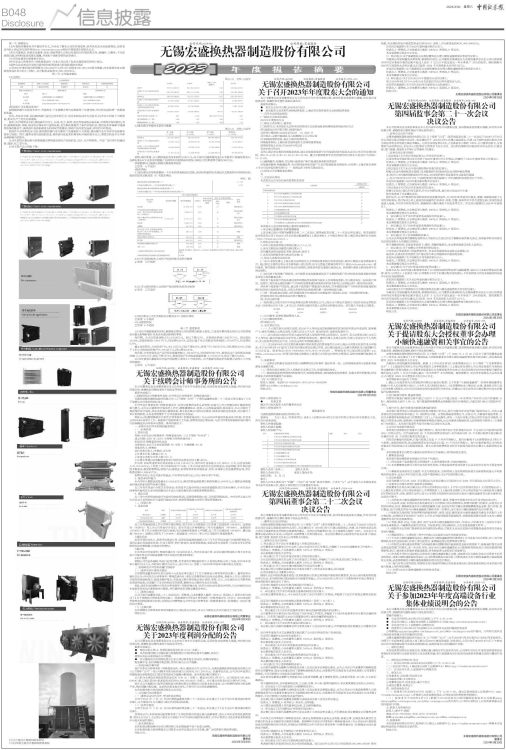 无锡宏盛换热器制造股份有限公司(以下简称“公司”)已于2024年3月30日发布公司2023年年度报告,为便于广大投资者更全面深入地了解公司2023年度经营成果、财务状况,公司计划于2024年4月9日下午参加2023年年度高端设备行业集体业绩说明会,就投资者关心的问题进行交流。