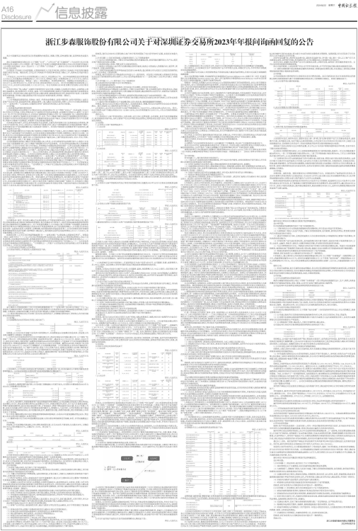 浙江步森服饰股份有限公司关于对深圳证券交易所2023年年报问询函回复的公告