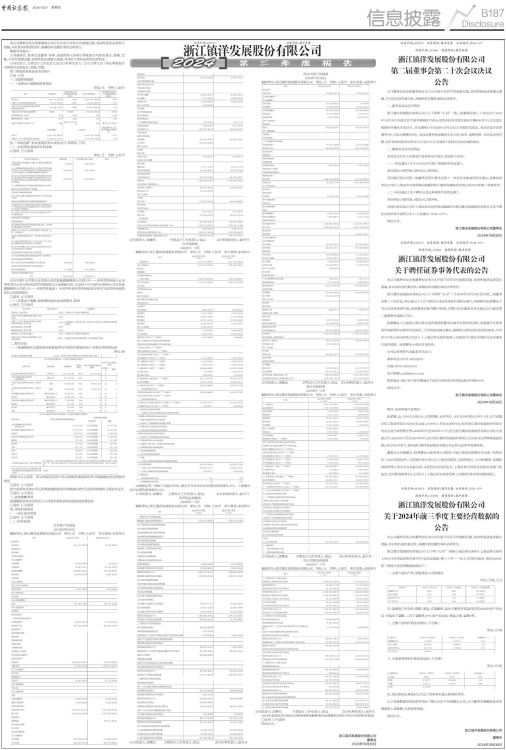 浙江镇洋发展股份有限公司(以下简称“公司”)第二届董事会第二十次会议于2024年10月30日在浙江省宁波市镇海区宁波石化经济技术开发区海天中路655号712会议室以现场结合通讯方式召开。会议通知已于2024年10月24日以书面形式送达。本次会议应出席董事9名,实际出席董事9名。会议由董事长沈曙光先生主持,监事、高管列席。本次会议的召集、召开和表决程序均符合《公司法》《公司章程》及相关法律法规的规定。