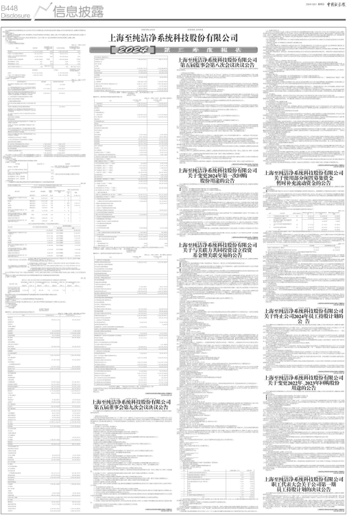 上海至纯洁净系统科技股份有限公司(以下简称“公司”或“本公司”)监事会已于2024年10月23日向全体监事发出了第五届监事会第八次会议通知,第五届监事会第八次会议于2024年10月29日上午以通讯方式召开,会议由监事会主席张婷女士主持,全体监事均出席会议。会议的召开符合《公司法》《公司章程》的规定,所作决议合法有效。
