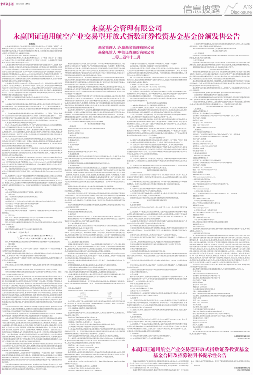 13、本公告仅对本基金募集的有关事项和规定予以说明。投资者欲了解本基金的详细情况,请详细阅读2024年12月20日登载于本公司网站(http://www.maxwealthfund.com)和中国证监会基金电子披露网站(http://eid.csrc.gov.cn/fund)的《永赢国证通用航空产业交易型开放式指数证券投资基金基金合同》和《永赢国证通用航空产业交易型开放式指数证券投资基金招募说明书》。