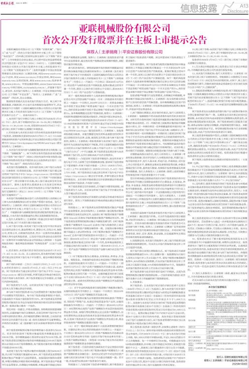 亚联机械股份有限公司(以下简称“亚联机械”、“发行人”或“公司”)首次公开发行股票并在主板上市(以下简称“本次发行”)的申请已经深圳证券交易所(以下简称“深交所”)上市审核委员会审议通过,并已获中国证券监督管理委员会同意注册(证监许可〔2024〕)1582号)。《亚联机械股份有限公司首次公开发行股票并在主板上市招股意向书》(以下简称“《招股意向书》”)及附件披露于中国证券监督管理委员会指定网站(巨潮资讯网,网址www.cninfo.com.cn;中证网,网址www.cs.com.cn;中国证券网,网址www.cnstock.com;证券时报网,网址www.stcn.com;经济参考网,www.jjckb.cn;中国金融新闻网,www.financialnews.com.cn;中国日报网,cn.chinadaily.com.cn),并置备于发行人、深交所、本次发行保荐人(主承销商)平安证券股份有限公司(以下简称“平安证券”、“保荐人(主承销商)”或“主承销商”)的住所,供公众查阅。 敬请投资者重点关注本次发行的发行方式、网上网下申购及缴款、回拨机制、中止发行及弃购股份处理等环节,并认真阅读今日刊登的《亚联机械股份有限公司首次公开发行股票并在主板上市初步询价及推介公告》(以下简称“《初步询价及推介公告》”)。具体内容如下: 1、本次网下发行申购日与网上申购日同为2025年1月16日(T日),其中,网下申购时间为9:30-15:00,网上申购时间为9:15-11:30,13:00-15:00。投资者在2025年1月16日(T日)进行网上和网下申购时无需缴付申购资金。 2、所有拟参与本次初步询价且符合相关投资者条件的网下投资者,须按照相关要求在2025年1月9日(T-5日)12:00前将核查材料和资产证明材料通过平安证券股份有限公司发行管理平台(https://stock.pingan.com/888/#/user/login)提交给保荐人(主承销商)。 3、本次发行采用向参与战略配售的投资者定向配售(以下简称“战略配售”)、网下向符合条件的投资者询价配售(以下简称“网下发行”)和网上向持有深圳市场非限售A股股份和非限售存托凭证市值的社会公众投资者定价发行(以下简称“网上发行”)相结合的方式进行。 本次发行的战略配售、初步询价及网上网下发行由保荐人(主承销商)负责组织实施。初步询价和网下发行通过深交所网下发行电子平台(https://eipo.szse.cn)及中国证券登记结算有限责任公司深圳分公司(以下简称“中国结算深圳分公司”)登记结算平台实施;网上发行通过深交所交易系统进行,请网上投资者认真阅读本公告及深交所网站(www.szse.cn)公布的《深圳市场首次公开发行股票网上发行实施细则》(深证上〔2018〕279号)(以下简称“《网上发行实施细则》”)。 本次发行的战略配售由发行人的高级管理人员和核心员工参与本次战略配售设立的专项资产管理计划组成。发行人和保荐人(主承销商)将在《亚联机械股份有限公司首次公开发行股票并在主板上市发行公告》(以下简称“《发行公告》”)中披露向参与战略配售的投资者配售的股票总量、认购数量、占本次发行股票数量的比例以及限售期限等信息。 4、发行人和保荐人(主承销商)将通过初步询价直接确定发行价格,网下不再进行累计投标询价。 5、网下发行对象:本次网下发行对象为经中国证券业协会注册的证券公司、基金管理公司、期货公司、信托公司、保险公司、财务公司、合格境外投资者、符合一定条件的私募基金管理人等专业机构投资者,以及经中国证券业协会注册的符合一定条件在中国境内依法设立的其他法人和组织(专业机构投资者和一般机构投资者统称“机构投资者”)以及个人投资者。 6、初步询价:本次发行初步询价时间为2025年1月10日(T-4日)9:30-15:00。在上述时间内,符合条件的网下投资者可通过深交所网下发行电子平台填写、提交申购价格和拟申购数量。 网下询价开始前一工作日(2025年1月9日,T-5日)上午8:30至初步询价日(2025年1月10日,T-4日)当日上午9:30前,网下投资者应当通过深交所网下发行电子平台(https://eipo.szse.cn)提交定价依据,并填写建议价格或价格区间,否则不得参与本次询价。网下投资者提交定价依据前,应当履行内部审批流程。 网下投资者为个人的,应在深交所网下发行电子平台提交经本人签字确认的定价依据。 参与网下询价的投资者可以为其管理的多个配售对象账户分别填报不同的报价,每个网下投资者最多填报3个报价,且最高报价不得高于最低报价的120%。网下投资者及其管理的配售对象报价应当包含每股价格和该价格对应的拟申购股数,同一配售对象只能有一个报价。 相关申报一经提交,不得全部撤销。因特殊原因需要调整报价的,应重新履行报价决策程序,在深交所网下发行电子平台填写说明改价理由、改价幅度的逻辑计算依据、之前报价是否存在定价依据不充分及(或)报价决策程序不完备等情况,并将改价依据及(或)重新履行定价决策程序等资料存档备查。 网下投资者和配售对象申报价格的最小变动单位为0.01元,初步询价阶段网下配售对象最低拟申购数量设定为100.00万股,拟申购数量最小变动单位设定为10.00万股,即网下投资者指定的配售对象的拟申购数量超过100.00万股的部分必须是10.00万股的整数倍,每个配售对象的拟申购数量不得超过500.00万股。 本次网下发行每个配售对象的申购股数上限为500.00万股,约占网下初始发行数量的42.45%。网下投资者及其管理的配售对象应严格遵守行业监管要求,加强风