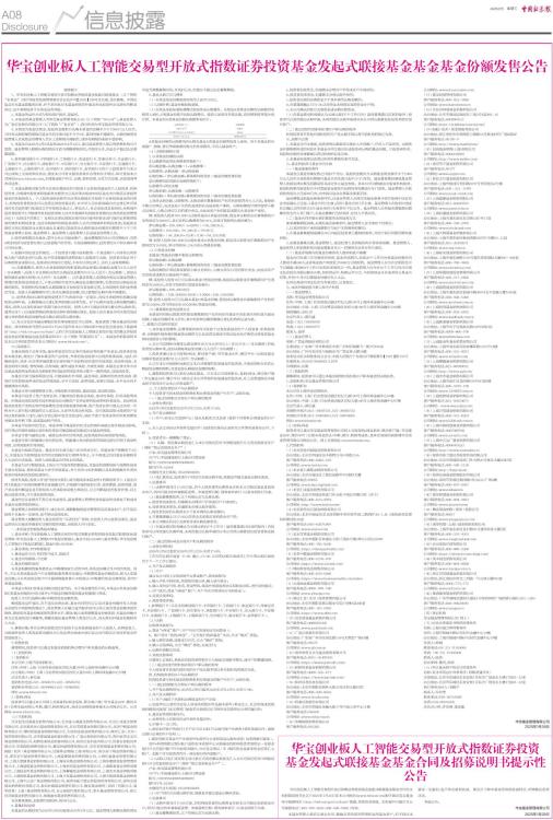 重要提示 1、华宝创业板人工智能交易型开放式指数证券投资基金发起式联接基金(以下简称“本基金”)经中国证券监督管理委员会证监许可【2025】146号文注册,进行募集。中国证监会对本基金募集的注册,并不表明其对本基金的投资价值及市场前景作出实质性判断或保证,也不表明投资于本基金没有风险。 2、本基金的运作方式为契约型开放式、发起式。 3、本基金的基金管理人为华宝基金管理有限公司(以下简称“本公司”),基金托管人为广发证券股份有限公司(以下简称“广发证券”),登记机构为华宝基金管理有限公司。 4、本基金为发起式基金,发起资金提供方认购本基金的金额不少于1000万元人民币,且持有认购份额的期限自基金合同生效日起不少于3年,期间份额不能赎回。认购份额的高级管理人员或基金经理等人员在上述期限内离职的,其持有期限的承诺不受影响。 5、本基金自2025年2月6日起至2025年2月12日,通过基金管理人指定的销售机构公开发售。基金管理人根据认购的情况可适当调整募集时间,并及时公告,但最长不超过法定募集期限。 6、持有建设银行卡、中国银行卡、工商银行卡、农业银行卡、华泰证券卡、兴业银行卡、 广发银行卡、民生银行卡、浦发银行卡、中信银行卡、光大银行卡、平安银行卡、交通银行卡、上海银行卡、上海农商行卡、长沙银行卡、南京银行卡、金华银行卡的个人投资者在与本公司达成网上交易的相关协议、接受本公司有关服务条款并办理相关手续后,即可登录本公司网站(www.fsfund.com),办理基金账户开立、认购、资料变更、分红方式变更、信息查询等各项业务。 7、本基金募集对象为符合法律法规规定的可投资于证券投资基金的个人投资者、机构投资者、合格境外投资者和发起资金提供方以及法律法规或中国证监会允许购买证券投资基金的其他投资人。个人投资者指依据有关法律法规规定可投资于证券投资基金的自然人;机构投资者指依法可以投资证券投资基金的、在中华人民共和国境内合法登记并存续或经有关政府部门批准设立并存续的企业法人、事业法人、社会团体或其他组织;合格境外投资者指符合《合格境外机构投资者和人民币合格境外机构投资者境内证券期货投资管理办法》(包括其不时修订)及相关法律法规规定使用来自境外的资金进行境内证券期货投资的境外机构投资者,包括合格境外机构投资者和人民币合格境外机构投资者;发起资金提供方指以发起资金认购本基金且承诺以发起资金认购的基金份额持有期限不少于三年的基金管理人股东、基金管理人、基金管理人高级管理人员或基金经理等人员。 8、投资者欲购买本基金,需开立本公司基金账户。基金募集期内本公司直销柜台、直销e网金同时为投资者办理开立基金账户的手续。在基金募集期间,投资者的开户和认购申请可同时办理。 9、根据中国证监会的规定,一个投资者只能开设和使用一个基金账户;不得非法利用他人账户或资金进行认购,也不得违规融资或帮助他人违规进行认购。投资者应保证用于认购的资金来源合法,投资者应有权自行支配,不存在任何法律上、合约上或其他障碍。 10、在募集期内,投资人在其他销售机构和直销e网金每笔认购最低金额为1元人民币(含认购费);投资人在直销柜台首次认购最低金额为10万元人民币(含认购费),追加认购的最低金额为每笔1元人民币(含认购费)。已在基金管理人直销柜台购买过基金管理人管理的其他基金的投资人,不受直销柜台首次认购最低金额的限制,但受追加认购最低金额的限制。各销售机构对最低认购限额及交易级差有其他规定的,以各销售机构的业务规定为准。投资人在募集期内可以多次认购基金份额,但已受理的认购申请不得撤销。 11、销售机构对认购申请的受理并不代表该申请一定成功,而仅代表销售机构确实接收到认购申请。认购的确认以登记机构的确认结果为准。对于认购申请及认购份额的确认情况,投资人应及时查询并妥善行使合法权利。投资人在T日规定时间内提交的认购申请,通常应自T+2日起到销售机构查询认购申请的确认情况。投资人应在基金合同生效后及时通过各销售机构查询最终成交确认情况和认购份额。 12、本公告仅对本基金募集的有关事项和规定予以说明。投资者欲了解本基金的详细情况,请详细阅读刊登在2025年1月28日发布在本公司网站和中国证监会基金电子披露网站(http://eid.csrc.gov.cn/fund)上的《华宝创业板人工智能交易型开放式指数证券投资基金发起式联接基金基金招募说明书》(以下简称“招募说明书”)。本基金的招募说明书及本公告将同时发布在本公司网站(www.fsfund.com)。 13、风险提示 本基金投资于证券市场,基金净值会因为证券市场波动等因素产生波动,投资者在投资本基金前,需充分了解本基金的产品特性,并承担基金投资中出现的各类风险,包括:因整体政治、经济、社会等环境因素对证券价格产生影响而形成的市场风险、流动性风险、本基金的特有风险、管理风险、信用风险、操作或技术风险、合规性风险、本基金法律文件中涉及基金风险特征的表述与销售机构对基金的风险评级可能不一致的风险、其他风险等。 本基金可参与股指期货交易,可能面临杠杆风险、基差风险、展期时的流动性风险、期货盯市结算