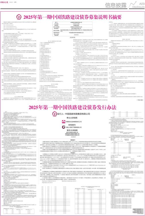 募集说明书摘要仅为向投资者提供有关本次发行的简书全文的各部分内容。募集说明书全文同时刊载于下列网站: http://www.sse.com.cn http://www.chinabond.com.cn http://www.chinamoney.com.cn 投资者在做出认购决定之前,应当仔细阅读募集说明书全文,并以其作为投资决定的依据。 释义 在本期债券募集说明书摘要中,除非上下文另有规定,下列词汇具有以下含义: 发行人或公司:指中国国家铁路集团有限公司。 中国铁路总公司:指原中国铁路总公司。 铁道部:指原中华人民共和国铁道部。 本期债券:指发行总规模为100亿元的“2025年第一期中国铁路建设债券”。 募集说明书摘要:指发行人根据有关法律、法规为发行本期债券而制作的《2025年第一期中国铁路建设债券募集说明书摘要》。 主承销商:指本期债券发行及存续期限内对华泰联合证券有限责任公司(以下简称“华泰联合证券”)、国开证券股份有限公司(以下简称“国开证券”)、国泰君安证券股份有限公司(以下简称“国泰君安证券”)、中信建投证券股份有限公司(以下简称“中信建投证券”)的总称。 牵头主承销商:指华泰联合证券。 承销团:指主承销商为本期债券发行组织的,由主承销商和分销商组成的承销团。 余额包销:指承销团全体成员按照承销协议的约定对发行人承担本期债券的余额包销责任。 中央结算公司:指中央国债登记结算有限责任公司。 证券登记公司:指中国证券登记结算有限责任公司。 招标系统:指中央结算公司提供的中国人民银行债券发行系统。本期债券招投标采用中央结算公司提供的中国人民银行债券发行系统。 招标:指由发行人与主承销商确定本期债券的招标利率区间;发行人在中央结算公司统一发标,投标人在招标系统规定的各自用户终端参与投标;投标结束后,发行人根据招标系统结果最终确定本期债券的发行利率和投标人中标金额的过程。有关部门人员将对招标全程进行现场监督。 投标人:指承销团成员。 招投标方式:指通过招标系统采用的单一利率(荷兰式)招标方式。 单一利率(荷兰式)投标方式:指每一有效订单中申购利率在发行利率以下的有效申购金额获得全额配售,申购利率等于发行利率的有效申购金额等比例获得配售的配售方式。 有效投标:指投标人按照募集说明书摘要和《2025年第一期中国铁路建设债券发行办法》规定发出的,经招标系统确认有效的投标。 发行利率:指发行人根据市场招标结果确定的本期债券最终票面年利率。 应急投标或债权托管应急申请:指如在本期债券招投标过程中,发生由于技术性或其他不可抗力产生的招标系统故障,投标人应填制本期债券的应急投标书或债权托管应急申请书,按要求加盖预留在招标系统的印鉴并填写密押后,在规定的投标时间内传送至招标现场。 招标额:就本期债券每一品种而言,指该品种参与招标的额度。本期债券10年期品种的招标额为50亿元,30年期品种的招标额为50亿元。 证监会:指中国证券监督管理委员会。 法定节假日或休息日:指中华人民共和国的法定及政府指定节假日或休息日(不包括香港特别行政区、澳门特别行政区和台湾省的法定节假日或休息日)。 工作日:指北京市的商业银行的对公营业日(不包含法定节假日或休息日)。 交易日:指按照证券交易所规定、惯例执行的可交易的日期。 元:如无特别说明,指人民币元。 第一章 债券发行依据 本期债券已经《中国证券监督管理委员会关于同意中国国家铁路集团有限公司公开发行铁路建设债券注册的批复》(证监许可〔2024〕1740号)注册通知文件同意公开发行。 第二章 本期债券发行的有关机构 一、发行人:中国国家铁路集团有限公司 二、担保人:铁路建设基金 三、承销团成员: (一)主承销商 1、华泰联合证券有限责任公司 2、国开证券股份有限公司 3、国泰君安证券股份有限公司 4、中信建投证券股份有限公司 (二)分销商 1、中信证券股份有限公司 2、中国国际金融股份有限公司 3、中德证券有限责任公司 4、中银国际证券股份有限公司 5、招商证券股份有限公司 6、广发证券股份有限公司 7、申万宏源证券有限公司 8、长城国瑞证券有限公司 9、国信证券股份有限公司 10、光大证券股份有限公司 四、托管人: 1、中央国债登记结算有限责任公司 2、中国证券登记结算有限责任公司上海分公司 五、中央结算公司 六、发行人审计机构:中兴财光华会计师事务所(特殊普通合伙) 七、信用评级机构:中诚信国际信用评级有限责任公司 八、财务顾问:中国人寿资产管理有限公司 九、发行人律师:北京市鑫河律师事务所 其他具体内容详见《2025年度中国铁路建设债券募集说明书》。 第三章 发行概要 一、发行人:中国国家铁路集团有限公司。 二、债券名称:2025年第一期中国铁路建设债券。 三、发行总额:100亿元。 四、债券期限:本期债券分为10年期和30年期两个品种,其中10年期品种的发行规模为50亿元,30年期品种的发行规模为50亿元,发行规模共100亿元。 五、债券利率:本期债券采用固定利率方式,10年期品种的票面年利率为Shibor基准利率加上基本利差,基本利差区间为(-0.6%~0.4%);30年期品种的票面年利率为Shibor基准利率加上基本利差,基本利差区间为(-0.4%~0.6%),Shibor基准利率为公告日前5个工作日全国银行间同业拆借中心在上海银行间同业拆放利率网(www.shibor.org)上公布