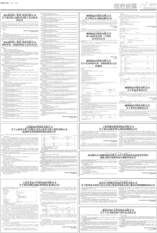证券代码:600249 证券简称:两面针 公告编号:临2025-007 柳州两面针股份有限公司 关于聘任公司副总裁的公告 本公司董事会及全体董事保证本公告内容不存在任何虚假记载、误导性陈述或者重大遗漏,并对其内容的真实性、准确性和完整性承担个别及连带责任。 柳州两面针股份有限公司(以下简称“公司”)于2025年2月10日召开第八届董事会第二十四次会议,审议通过了《关于聘任熊剑峰先生为公司副总裁的议案》。经公司总裁提名,董事会提名委员会资格审查,熊剑峰先生的任职资格符合《公司法》等相关法律法规、规范性文件以及《公司章程》的有关规定,不存在被中国证监会确定为市场禁入者并且禁入尚未解除的情形,具备担任上市公司高级管理人员的任职要求。公司董事会决定聘任熊剑峰先生为公司副总裁(简历详见附件),任期与公司第八届董事会任期一致。 特此公告。 柳州两面针股份有限公司 董事会 2025年2月11日 附:熊剑峰先生简历: 熊剑峰先生,1984年生,大学学历,管理学学士和法学学士,曾任广西玉柴机器集团有限公司人力资源部总经理助理,玉柴东特专用汽车有限公司副总经理、总经理,广西柳州市产业投资发展集团有限公司投资发展部部长、战略投融资部总经理,柳州市政府投资引导基金责任有限公司董事长、总经理,柳州市创新创业投资引导基金有限责任公司董事长、总经理。 证券代码:600249 证券简称:两面针 公告编号:临2025-006 柳州两面针股份有限公司 第八届董事会第二十四次 会议决议公告 本公司董事会及全体董事保证本公告内容不存在任何虚假记载、误导性陈述或者重大遗漏,并对其内容的真实性、准确性和完整性承担个别及连带责任。 柳州两面针股份有限公司(以下简称“公司”)第八届董事会第二十四次会议于2025年2月10日以通讯方式召开。会议通知于2025年2月7日以电子邮件方式发出,会议应表决董事七名,实际参加表决董事七名。会议召开符合《公司法》《公司章程》和《公司董事会议事规则》的有关规定。 会议经审议并以记名投票方式表决,形成决议如下: 一、审议通过了《关于补选周云祥先生为第八届董事会非独立董事的议案》,提请公司股东大会审议; 详见公司同期披露的《两面针关于补选董事的公告》(临2025-004) 本议案已经董事会提名委员会审议通过,同意提交董事会审议。 同意本议案的7票,反对本议案的0票,弃权0票。 二、审议通过了《关于聘任熊剑峰先生为公司副总裁的议案》; 详见公司同期披露的《两面针关于聘任公司副总裁的公告》(临2025-007)。 本议案已经董事会提名委员会审议通过,同意提交董事会审议。 同意本议案的7票,反对本议案的0票,弃权0票。 三、审议通过了《关于提请召开公司2025年第一次临时股东大会的议案》; 公司决定于2025年2月27日在公司会议室召开2025年第一次临时股东大会,详见公司同期披露的《两面针关于召开2025年第一次临时股东大会的通知》(临2025-005)。 同意本议案的7票,反对本议案的0票,弃权0票。 特此公告。 柳州两面针股份有限公司 董事会 2025年2月11日 证券代码:600249 证券简称:两面针 公告编号:临2025-005 柳州两面针股份有限公司 关于召开2025年第一次临时股东大会的通知 本公司董事会及全体董事保证本公告内容不存在任何虚假记载、误导性陈述或者重大遗漏,并对其内容的真实性、准确性和完整性承担法律责任。 重要内容提示: ● 股东大会召开日期:2025年2月27日 ● 本次股东大会采用的网络投票系统:上海证券交易所股东大会网络投票系统 一、召开会议的基本情况 (一)股东大会类型和届次 2025年第一次临时股东大会 (二)股东大会召集人:董事会 (三)投票方式:本次股东大会所采用的表决方式是现场投票和网络投票相结合的方式 (四)现场会议召开的日期、时间和地点 召开的日期时间:2025年2月27日 15点00分 召开地点:广西柳州市东环大道282号本公司五楼会议室。 (五)网络投票的系统、起止日期和投票时间。 网络投票系统:上海证券交易所股东大会网络投票系统 网络投票起止时间:自2025年2月27日 至2025年2月27日 采用上海证券交易所网络投票系统,通过交易系统投票平台的投票时间为股东大会召开当日的交易时间段,即9:15-9:25,9:30-11:30,13:00-15:00;通过互联网投票平台的投票时间为股东大会召开当日的9:15-15:00。 (六)融资融券、转融通、约定购回业务账户和沪股通投资者的投票程序 无 (七)涉及公开征集股东投票权 无 二、会议审议事项 本次股东大会审议议案及投票股东类型 ■ 1、各议案已披露的时间和披露媒体 上述议案具体内容详见于2025年2月11日在《上海证券报》《中国证券报》《证券日报》及上海证券交易所网站披露的公告,或详见股东大会召开前在上述平台披露的会议资料。 2、特别决议议案:无 3、对中小投资者单独计票的议案:1 4、涉及关联股东回避表决的议案:无 应回避表决的关联股东名称:无 5、涉及优先股股东参与表决的议案:无 三、股东大会投票注意事项 (一)本公司股东通过上海证券交易所股东大会网络投票系统行使表决权的,既可以登陆交易系统投票平台(通过指定交易的证券公司交易终端)进行投票,也可以登陆互联网投票平台(网址:vote.sseinfo.com)进行投票。首次登陆互联网投票平台进行投票的,投资者需要完成股东身份认证。具体操作请见互