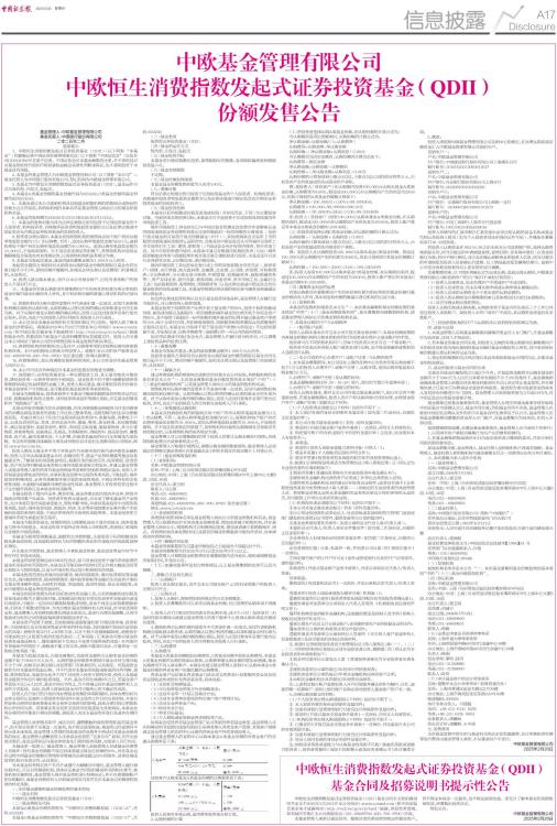 中欧恒生消费指数发起式证券投资基金(QDII)基金合同全文和招募说明书全文于2025年2月20日在本公司网站(www.zofund.com)和中国证监会基金电子披露网站(http://eid.csrc.gov.cn/fund)披露,供投资者查阅。如有疑问可拨打本公司客服电话(021-68609700、400-700-9700)咨询。 本基金管理人承诺以诚实信用、勤勉尽责的原则管理和运用基金资产,但不保证本基金一定盈利,也不保证最低收益。请充分了解本基金的风险收益特征,审慎做出投资决定。 特此公告。 中欧基金管理有限公司 2025年2月20日