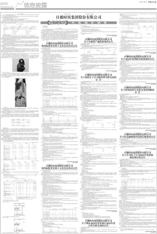 第一节 重要提示 1、本年度报告摘要来自年度报告全文,为全面了解本公司的经营成果、财务状况及未来发展规划,投资者应当到www.sse.com.cn网站仔细阅读年度报告全文。 2、本公司董事会、监事会及董事、监事、高级管理人员保证年度报告内容的真实性、准确性、完整性,不存在虚假记载、误导性陈述或重大遗漏,并承担个别和连带的法律责任。 3、公司全体董事出席董事会会议。 4、众华会计师事务所(特殊普通合伙)为本公司出具了标准无保留意见的审计报告。 5、董事会决议通过的本报告期利润分配预案或公积金转增股本预案 根据众华会计师事务所(特殊普通合伙)审计,公司2024年度实现归属于上市公司股东的净利润-158,620,807.20 元,截至2024年12月31日,母公司报表中可供分配利润为212,397,966.89 元。鉴于公司2024年度实现可供股东分配的净利润为负,不满足《公司章程》规定的利润分配条件,为了保障公司正常的生产经营和发展,公司2024年度拟不进行现金股利分配、不进行资本公积金转增股本、不送红股。 第二节 公司基本情况 1、公司简介 ■ ■ 2、报告期公司主要业务简介 根据中国证监会颁布的上市公司行业分类结果,公司属于“C 制造业”大类下的“C18 纺织服装、服饰业”。 2024年,由于全球经济增长放缓、市场需求收缩,在国家宏观政策等积极因素支持下,消费市场规模保持平稳增长态势,但受短期有效需求不足、终端消费偏弱等因素的影响,服装行业普遍承压,服装零售整体呈现弱增长趋势。服装行业围绕推动企业数字化、智能化升级,不断增强产业核心竞争力和产业链现代化建设,通过推进数字化转型、产品升级、全渠道运营和品牌建设等战略举措来促进产业转型升级,巩固市场地位。 1、宏观政策扩内需,促进经济发展稳中有进 根据国家统计局发布的《2024年经济运行稳中有进 主要发展目标顺利实现》,经初步核算,2024年全国国内生产总值同比增长5.0%,2024年社会消费品零售总额同比增长3.5%,其中,限额以上单位服装类商品零售额同比2023年提升0.3个百分点。随着国家加大宏观政策实施力度,“扩内需、提信心”政策措施逐步落实落地,预计经济发展稳中有进。 2、线上线下融合发展,赋能实体经济转型 线上与线下融合的趋势已成为服装行业的一大发展机遇,结合了电子商务的便捷性和实体店的体验感,新零售模式正在成为推动服装消费的新动力,新零售模式通过整合线上、线下资源,实现消费者体验的无缝对接,使购物更加便捷和愉悦。服装零售企业可以提升服务效率和顾客满意度,并通过大数据分析深入了解消费者行为和购物偏好,实现精准营销,提升市场竞争力。 3、消费层次多元复杂,回归本质精益经营 随着社会环境发展和消费者的需求迭代,消费者呈现“悦己”与“理性”需求并存的特点。一方面,消费者的“悦己需求”表现为对品质和体验的需求,更注重品牌消费过程中的体验和服务,消费目的从“悦人”转变为“悦己”。另一方面,消费者的“理性需求”表现为对质价比的追求,中国服装行业回归行业本质,拼内功、做深品牌和产品,正成为行业共识。越来越多的企业通过组织变革、流程再造、人才激活、数字化转型等方式,围绕品牌力、产品力、渠道力、供应链能力等加强深耕和精细化运营,不断提升品牌价值和经营质量,保证品牌更稳健、可持续增长。 (一)主营业务 日播时尚主营业务为精品服装的设计创意、材料及工艺技术研发、生产销售、客户服务,专注于中高端时尚女装领域。我们期望为客户提供真正满足其内心渴望的服饰产品与服务,打造时尚的生活方式。 “播 broadcast”品牌创立于1999年,是中国早期真正意义上原创性的都市女装品牌之一。成立至今,都市中成长型女性的处世价值始终是品牌美学的对焦之处。率真、从容而不失时代性的女性形象是品牌一贯的心中缪斯,它所折射出的自在,是心灵觉知下的本然状态。这份睿知与自在,既是 [播 broadcast] 此刻的坐标,也是下一段旅程的起点。2024年,著名演员倪妮继续牵手“播 broadcast”为品牌代言人。截止至2024年12月末,“播 broadcast”品牌店铺数量总计569家。 ■ 播 broadcast时尚大片 “播broadcute”为公司旗下童装品牌,创立于2018年,面向3-8岁儿童。品牌缘起自“给予不分大小”的信念初衷,秉持着“一颗善良的心才是美的服饰”的审美理念,启发孩子们去理解美丽的内涵:美丽不只关乎外表,关爱与帮助他人更是由心而发的美丽。“播broadcute”充分顺应孩子们爱动的天性,从穿着舒适性出发,倾向于使用环保亲肤的自然纤维布料,在可承受的范围内,让好的材质和不过时的设计灵感碰撞出可传承的、物有所值的衣服。截止至2024年12月末,“播broadcute”品牌店铺数量总计6家。 播broadcute时尚大片 ■ ■ (二)经营模式 公司采取“全渠道、轻资产、数智能、精运维”的运营管理模式,全力打造以“用户价值体验为核心”的营销链、商品链、服务链、社群链,为用户精准地提供高品质的商品、贴心服务和便捷的购物体验。 1、全网精准营销模式 公司实行以内容、传播策划为核心的全网精准营销模式。原创与品牌文化、产品定位、时尚穿搭等相关的高质量图文、短视频内容,同时也邀请明星友人、KOL、KOC、核心客户等加入内容创作联盟,快速构建品宣和营销矩阵,通过大数据分析、新媒体