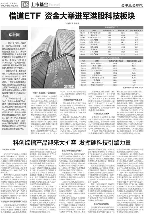 □本报记者 张凌之 上周(2月24日—2月28日)A股市场出现调整。大基建相关板块受政策预期影响,逆势走强,钢铁、建材、房地产领域涨幅居前,此前连续走强的科技板块则出现调整。ETF方面,上周全市场仅有11.94%的ETF实现正收益,食品饮料、基建相关ETF涨幅居前,TMT相关ETF普跌。 资金流向方面,上周全市场ETF总体呈资金净流出状态,净流出额近85亿元。股票型ETF同样出现资金大幅净流出,一周资金净流出超190亿元。港股科技主题ETF成为上周ETF市场吸金主力,在周度资金净流入榜单中,4只港股科技主题ETF合计吸金近75亿元。 ETF市场持续扩容。2月28日,首批科创综指ETF中,建信上证科创板综合ETF率先上市,其余科创综指ETF将于3月上旬陆续上市。2月27日至2月28日,跟踪科创综指的新增指数基金产品上报28只。此外,2月27日,首批自由现金流主题ETF上市。近期,多家公募机构陆续上报跟踪国证自由现金流、沪深300自由现金流的相关指数产品。 港股科技主题ETF大幅吸金 2月24日—2月28日,A股市场先扬后抑。ETF方面,上周全市场仅有129只ETF实现正收益,正收益占比11.94%。食品饮料ETF基金领涨全市场,上周涨幅为4.14%。多只大基建ETF表现不俗,钢铁ETF、房地产ETF、地产ETF、基建ETF等涨幅居前。受固态电池行业利好影响,两只科创新能源ETF也进入周度涨幅榜。 2月以来,港股科技主题ETF一骑绝尘,2月ETF涨幅榜单普遍被港股科技主题ETF占据,这类ETF涨幅普遍超过20%,且多数港股科技主题ETF均呈现资金净流入态势。 不过,受A股市场高低切换因素影响,上周TMT相关ETF普跌,云计算沪港深ETF跌13.41%,电信50ETF、云计算ETF等跌幅均超10%。周度跌幅前十位的ETF均为TMT相关ETF。 资金整体呈净流出态势 整体来看,上周全市场ETF总体呈资金净流出状态。Wind数据显示,2月24日至2月28日,全市场ETF资金净流出额达到84.49亿元。股票型ETF上周也出现净流出,净流出额193.60亿元。 具体来看,资金净流入方面,港股科技主题ETF成为吸金主力。一周资金净流入额前十位的ETF中,有4只为港股科技主题ETF,合计吸金近75亿元。上周资金净流入额前十位的ETF中,还出现了机器人、人工智能相关ETF,合计吸金超40亿元。另外,港股创新药ETF上周净流入额达18.75亿元。 资金净流出方面,上周多只宽基ETF净流出额居前,其中沪深300ETF(510300)净流出66.28亿元;净流出额居前的还有沪深300ETF易方达、中证500ETF、上证50ETF、沪深300ETF、科创50ETF等多只宽基ETF。在上周净流出额前十位的ETF中,除两只为货币ETF外,其余均为宽基ETF。 AI板块或反复活跃 展望后市,光大证券表示,当前A股市场的估值处于2010年以来的均值水平附近,随着政策的积极发力,中长期资金以及前期赚钱效应带来的增量资金或加速流入市场,有望进一步提升A股市场的估值。 中银证券认为,在基本面预期修复、政策释放提振资本市场信心以及科技龙头重估等多方面因素共振下,市场仍处于持续上行的轨道中。 华夏基金表示,长期看好以科技板块为代表的港股市场投资价值,短期看情绪,中期看估值,长期看产业趋势和业绩兑现,建议进一步关注港股市场投资机遇。在市场成交持续活跃后,可以关注性价比较高的消费方向。 机构普遍认为,上周科技、人工智能(AI)方向出现大幅回调,并不意味着行情结束。兴业证券表示,AI作为当下市场最为聚焦的主线方向,虽然短期成交占比升至高位可能导致板块出现阶段性的震荡调整,但不会导致行情系统性终结。中长期来看,在当前产业链各环节催化因素不断、产业叙事持续焕新的背景下,AI板块或反复活跃,主线地位有望进一步巩固,或继续成为市场中长期聚焦的主线方向。
