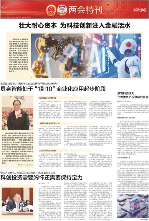2025年被业界视为具身智能商业化发展的起点。目前,机器人在理解、感知以及交互方面都有了更加成熟稳定的表现,逐渐从实验室迈向更多应用场景。“一项科学研究成果,在从实验室走向市场的准备阶段是最难的,要跨越很多鸿沟,风险特别大。”全国政协委员、中国科学院自动化研究所研究员赵晓光在接受记者采访时表示,当前,具身智能技术便处于这种“1到10”的重要阶段,需要更多的耐心资本,以及保护创新者利益的社会共识。 “我还是比较乐观的,相信未来10至15年,我们就能拥有人形机器人这样的‘助手’。”赵晓光对具身智能技术未来的普及应用充满信心。 ● 本报记者 杨洁 王婧涵 处在商业化关键阶段 2025年,“具身智能”首次被写入政府工作报告。 何为具身智能?赵晓光介绍:“具身智能是指具有身体的智能,包括一个机器大脑能够帮助决策,以及肢体能够快速进行反应,其核心在于实体设备与智能决策的深度融合。”她表示,这一概念最早由艾伦·图灵于1948年提出,区别于仅依赖计算的“离身智能”,具身智能设备既能通过传感器感知物理世界,又能借助大模型理解任务、自主决策并执行。其中,人形机器人因体现了对人类体力和智力的仿生,是具身智能中特殊且较为高端的一种形态。 在赵晓光看来,很多应用场景,不一定需要人形机器人来完成,也许轮式、四足等具身智能设备对任务的执行效率更高,但人形机器人由于具有与人类接近的外在形象,在交互与服务过程中更能让人有亲近感,对于未来养老等服务场景会是一个很好的选择。“未来我们还希望为我们服务的人形机器人,胳膊是软的、有温度的,这将是人形机器人重要发展方向。” 有观点认为2025年是人形机器人商用的元年,对此,赵晓光表示,更准确的说法应该是其处在商业化应用的起点,大规模拓展应用仍需时日。“具身智能正处在从实验室走向市场的关键阶段。随着技术、市场需求不断发展,人形机器人一定会非常受欢迎。” 大模型带来更聪明的大脑 ChatGPT、DeepSeek等大模型的技术突破,让具身智能的发展如虎添翼。“大模型给了机器人一个更聪明的大脑。”赵晓光表示。 畅想具身智能机器人成为科研人员的实验室助手,赵晓光描述,假设我们需要机器人助手帮忙取回焊接好的电路板,传统的机器人仅能执行预设的指令,而具身智能机器人则能够依托大模型,自主完成环境感知、记忆检索、路径规划与任务执行的全链条过程。 “比如,机器人通过大模型的推理能力拆解任务,通过记录的实验室过往视频,准确定位电路板的位置,再结合实时导航,才能送至我所指定的地点。”赵晓光表示,这一过程模拟了人类的感知、记忆、思考与执行的四重智能。如果没有大模型,机器人仅能依赖固定编程,缺少对环境的适应,能力将大幅受限。 赵晓光认为,具身智能的核心就在于“将大模型的决策力与机器人的执行力无缝衔接”。当前机器人对复杂任务的反应速度和执行能力仍逊于人类,磨合期不可避免。新助手需要时间来熟悉工作,机器人也是如此,但是它会通过持续的强化学习来优化表现。要对具身智能设备的“进化”有耐心、有信心。 她表示,机器人替代重复性、危险性的工作岗位是大势所趋。目前,手术机器人已在外科领域崭露头角,其稳定性与精度远超人类医生,这类规律性强的场景将率先取得突破。 交叉学科需重点突破 赵晓光认为,未来十年是具身智能领域发展的快速上升期,同时这也是一个大浪淘沙、去伪存真的过程,需经历技术验证、场景适配与成本优化三重考验。 她表示,当前具身智能机器人正处于技术产业化“1到10”的阶段,既需科学家攻克“卡脖子”难题,也离不开社会对创新试错的包容。 “发展具身智能是系统工程,绝非单一领域能独立完成。”赵晓光提出,技术瓶颈既存在于基础算法与执行硬件,更涉及新材料等交叉学科。例如,柔性人工肌肉材料可提升机器人关节灵活性,耐磨涂层能延长设备寿命。这些创新技术的突破,都将极大助力具身智能设备的广泛应用。 同时,赵晓光希望能有更多耐心资本助力行业成长。具身智能技术还需要政策、金融、市场共同托举。“有了更丰富的金融产品支持,更丰富的融资渠道,以及保护创新者利益的社会共识,我相信包括具身智能在内的新技术会不断进步、不断成熟。”赵晓光表示。