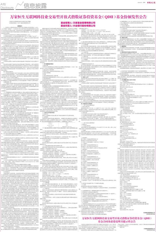 万家恒生互联网科技业交易型开放式指数证券投资基金(QDII)基金合同全文和招募说明书全文于2025年3月10日在本公司网站(www.wjasset.com)和中国证监会基金电子披露网站(http://eid.csrc.gov.cn/fund)披露,供投资者查阅。如有疑问可拨打本公司客服电话(400-888-0800)咨询。 本基金管理人承诺以诚实信用、勤勉尽责的原则管理和运用基金资产,但不保证本基金一定盈利,也不保证最低收益。请充分了解本基金的风险收益特征,审慎做出投资决定。 特此公告。 万家基金管理有限公司 2025年3月10日