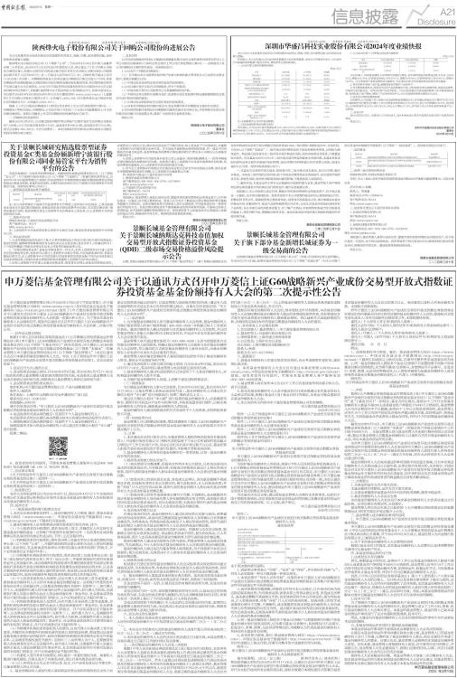 为更好地满足广大投资者的理财需求,根据景顺长城基金管理有限公司(以下简称“本公司”)与宁波银行股份有限公司(以下简称“宁波银行”)签署的委托销售协议,自2025年3月10日起新增委托宁波银行同业易管家平台销售景顺长城研究精选股票型证券投资基金C类基金份额,具体的业务流程、办理时间和办理方式以宁波银行同业易管家平台的规定为准。现将相关事项公告如下: 一、适用基金及基金业务开通情况 ■ 注:本公司新增委托宁波银行同业易管家平台销售上述列表中对应基金,上表仅就基金本身是否开通定期定额投资、转换业务和是否参加销售平台申购(含定期定额申购)费率优惠进行说明,投资者能否通过上述销售平台办理基金上述业务,以上述销售平台的安排和规定为准。 二、销售平台信息 销售机构名称:宁波银行同业易管家平台 客户服务电话: 95574 网址:www.nbcb.cn 注:上述销售平台具体销售安排以销售平台规定为准,敬请投资者留意销售平台的相关公告。 三、相关业务说明 1、上述申购赎回业务仅适用于处于正常申购期及处于特定开放日和开放时间的基金。基金封闭期、募集期等特殊期间的有关规定详见对应基金的《基金合同》、《招募说明书》、《产品资料概要》等相关法律文件及本公司发布的最新业务公告。 2、“定期定额投资业务”是基金申购业务的一种方式,如果上述销售平台开通上述基金定投定额投资业务,投资者可以通过上述销售平台提交申请,约定每期扣款时间、扣款金额及扣款方式,由上述销售平台于约定扣款日在投资者指定的资金账户内自动完成扣款以及基金申购业务,具体的业务办理规则和程序请遵循上述销售平台的有关规定。 3、如果上述销售平台开通上述基金转换业务,投资者在办理上述基金的转换业务时,应留意本公司相关公告,确认转出基金处于可赎回状态,转入基金处于可申购状态,并遵循上述销售平台的规定提交业务申请。关于基金开通转换业务的限制因素、同一基金不同份额是否开通互转业务、基金转换业务的费率计算及规则请另行参见本公司相关公告或基金招募说明书。 4、如果上述销售平台为投资者开放本公司上述基金(限前端收费模式)一次性申购或定期定额投资申购费率折扣优惠,投资者可通过上述销售平台享受申购费率折扣优惠,具体的费率优惠规则,以上述销售平台的安排和规定为准。 5、若今后上述销售平台依据法律法规及基金相关法律文件对投资起点金额、级差及累计申购限额等标准进行调整,以上述销售平台最新规定为准。 四、投资者可通过以下途径咨询有关详情 1、景顺长城基金管理有限公司 客户服务电话:400 8888 606、0755-82370688 网址:www.igwfmc.com 2、宁波银行同业易管家平台 客户服务电话: 95574 网址:www.nbcb.cn 风险提示:基金管理人承诺以诚实信用、勤勉尽责的原则管理和运用基金资产,但不保证基金一定盈利,也不保证最低收益。投资人应当充分了解基金定期定额投资和零存整取等储蓄方式的区别。定期定额投资是引导投资人进行长期投资、平均投资成本的一种简单易行的投资方式。但是定期定额投资并不能规避基金投资所固有的风险,不能保证投资人获得收益,也不是替代储蓄的等效理财方式。投资者投资于上述基金时应认真阅读上述基金的基金合同、招募说明书等文件。敬请投资者留意投资风险。 特此公告。 景顺长城基金管理有限公司 二〇二五年三月十日 景顺长城基金管理有限公司 关于景顺长城纳斯达克科技市值加权交易型开放式指数证券投资基金(QDII)二级市场交易价格溢价风险提示公告 近期,景顺长城基金管理有限公司(以下简称“基金管理人”)旗下景顺长城纳斯达克科技市值加权交易型开放式指数证券投资基金(QDII)(场内简称:纳指科技ETF,交易代码:159509,以下简称“本基金”)二级市场交易价格明显高于基金份额参考净值,出现较大幅度溢价。特此提示投资者关注二级市场交易价格溢价风险,投资者如果盲目投资,可能遭受较大损失。若本基金2025年3月10日二级市场交易价格溢价幅度未有效回落,本基金有权采取向深圳证券交易所申请盘中临时停牌、延长停牌时间等措施以向市场警示风险,具体以届时公告为准。现特向投资者提示如下: 一、本基金为交易型开放式基金,投资者可在二级市场交易本基金,也可以申购、赎回本基金。本基金二级市场的交易价格,除了有基金份额净值变化的风险外,还会受到市场供求关系、系统性风险、流动性风险等其他因素的影响,可能使投资人面临损失。 二、截至目前,本基金运作正常且无应披露而未披露的重大信息,基金管理人将严格按照法律法规及基金合同的规定进行投资运作,履行信息披露义务。 风险提示:本公司承诺以诚实信用、勤勉尽责的原则管理和运用基金资产,但不保证基金一定盈利,也不保证最低收益。投资者投资于本公司管理的基金时应认真阅读基金合同、招募说明书等文件。敬请投资者注意投资风险。投资者在投资基金之前,请仔细阅读本基金的基金合同、招募说明书、基金产品资料概要等法律文件,全面认识基金的风险收益特征和产品特性,充分考虑自身的风险承受能力,在了解产品情况、听取销售机构适当性匹配意见的基础上,理性判断市场,谨慎做出投资决策。基金具体风险评级结果以销售机构
