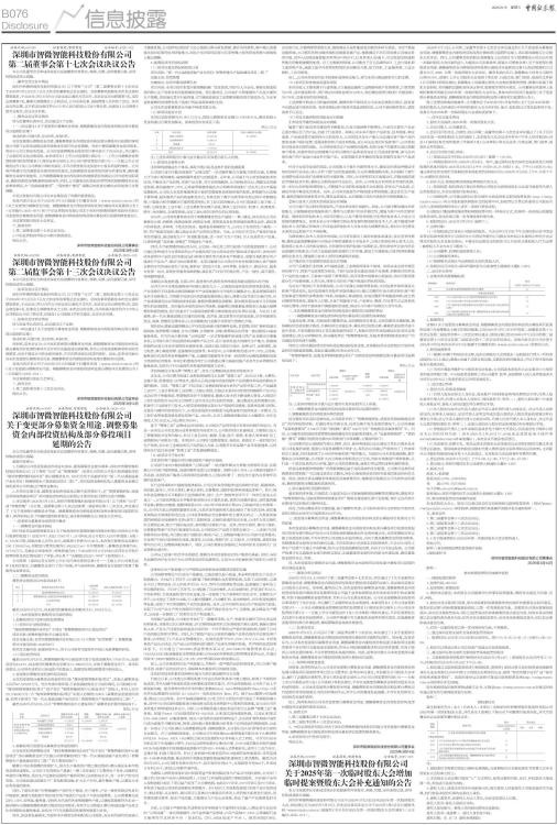 证券代码:001339 证券简称:智微智能 公告编号:2025-012 深圳市智微智能科技股份有限公司 第二届董事会第十七次会议决议公告 本公司及董事会全体成员保证信息披露的内容真实、准确、完整,没有虚假记载、误导性陈述或重大遗漏。 一、董事会会议召开情况 深圳市智微智能科技股份有限公司(以下简称“公司”)第二届董事会第十七次会议于2025年3月12日以口头方式向全体董事发出会议通知,全体董事同意豁免本次会议通知期限要求,于2025年3月13日在公司会议室以通讯方式召开。本次会议应出席董事7名,实际出席董事7名,董事长袁微微女士主持会议,公司全体监事、高级管理人员列席了会议。本次会议的召集、召开和表决程序符合《中华人民共和国公司法》等法律、法规及《公司章程》的有关规定,会议合法有效。 二、董事会会议审议情况 经与会董事认真审议,会议通过以下议案: (一)审议通过《关于变更部分募集资金用途、调整募集资金内部投资结构及部分募投项目延期的议案》 表决结果:同意7票,反对0票,弃权0票。 本次变更部分募集资金用途、调整募集资金内部投资结构及部分募投项目延期的事项是公司基于业务发展规划及市场需求而进行的必要调整,有助于提高募集资金使用效率、有利于公司主营业务发展。公司对变更募集资金投资项目事项进行了充分论证,并已履行了必要的审议及决策流程。本事项符合《上市公司监管指引第2号一一上市公司募集资金管理和使用的监管要求》《深圳证券交易所上市公司自律监管指引第1号一一主板上市公司规范运作》及《公司章程》等相关规定,不存在损害股东尤其是中小股东利益的情形。公司将严格遵守有关募集资金使用的相关规定,加强募集资金使用的内部与外部监督,确保募集资金高效合规使用。公司调整募集资金内部投资结构能够更好地满足公司当前的实际需求,确保资源的合理配置和高效利用;同时,公司董事会拟授权经营管理层根据募投项目最新需求情况,在“设备购置费用”、“营销推广费用”调整后的投资总额内对明细进行合理调整。 中信证券股份有限公司对本议案发表了同意的核查意见。 具体内容详见公司于2025年3月15日披露于巨潮资讯网(www.cninfo.com.cn)的《关于变更部分募集资金用途、调整募集资金内部投资结构及部分募投项目延期的公告》(公告编号:2025-014)和《中信证券股份有限公司关于深圳市智微智能科技股份有限公司变更部分募集资金用途、调整募集资金内部投资结构及部分募投项目延期的核查意见》。 本议案需提交股东大会审议。 三、备查文件 1、第二届董事会第十七次会议决议; 2、中信证券股份有限公司相关核查意见。 特此公告。 深圳市智微智能科技股份有限公司董事会 2025年3月14日 证券代码:001339 证券简称:智微智能 公告编号:2025-013 深圳市智微智能科技股份有限公司 第二届监事会第十三次会议决议公告 本公司及监事会全体成员保证信息披露的内容真实、准确、完整,没有虚假记载、误导性陈述或重大遗漏。 一、监事会会议召开情况 深圳市智微智能科技股份有限公司(以下简称“公司”)第二届监事会第十三次会议于2025年3月12日以口头方式向全体监事发出会议通知,全体监事同意豁免本次会议通知期限要求,于2025年3月13日在公司会议室以通讯方式召开。本次会议应出席监事3名,实际出席监事3名,监事会主席柳曼玲女士主持。本次会议的召集、召开和表决程序符合《中华人民共和国公司法》等法律、法规及《公司章程》的有关规定,会议合法有效。 二、监事会会议审议情况 经与会监事认真审议,会议通过以下议案: (一)审议通过《关于变更部分募集资金用途、调整募集资金内部投资结构及部分募投项目延期的议案》 表决结果:同意3票,反对0票,弃权0票。 经审核,监事会认为:公司本次变更部分募集资金用途、调整募集资金内部投资结构及部分募投项目延期的事项不会对项目实施造成实质影响,符合公司发展战略需求和实际经营需要,有利于提高公司资金使用效率,不存在损害股东利益的情形。因此,监事会同意公司本次变更部分募集资金用途、调整募集资金内部投资结构及部分募投项目延期。 具体内容详见公司于2025年3月15日披露于巨潮资讯网(www.cninfo.com.cn)的《关于变更部分募集资金用途、调整募集资金内部投资结构及部分募投项目延期的公告》(公告编号:2025-014)。 本议案需提交股东大会审议。 三、备查文件 1、第二届监事会第十三次会议决议。 特此公告。 深圳市智微智能科技股份有限公司监事会 2025年3月14日 证券代码:001339 证券简称:智微智能 公告编号:2025-014 深圳市智微智能科技股份有限公司 关于变更部分募集资金用途、调整募集资金内部投资结构及部分募投项目 延期的公告 本公司及董事会全体成员保证信息披露的内容真实、准确、完整,没有虚假记载、误导性陈述或重大遗漏。 重要内容提示: 1、为满足公司经营发展及市场变化需求,提高募集资金使用效率,深圳市智微智能科技股份有限公司(以下简称“公司”或“智微智能”)拟将公司首次公开发行股票募投项目“谢岗智微智能科技项目”部分募集资金10,100万元用于实施新项目“新一代AI基础设施产业化项目(智微智能生产基地建设项目二期)”,项目投资金额和拟投入募集资