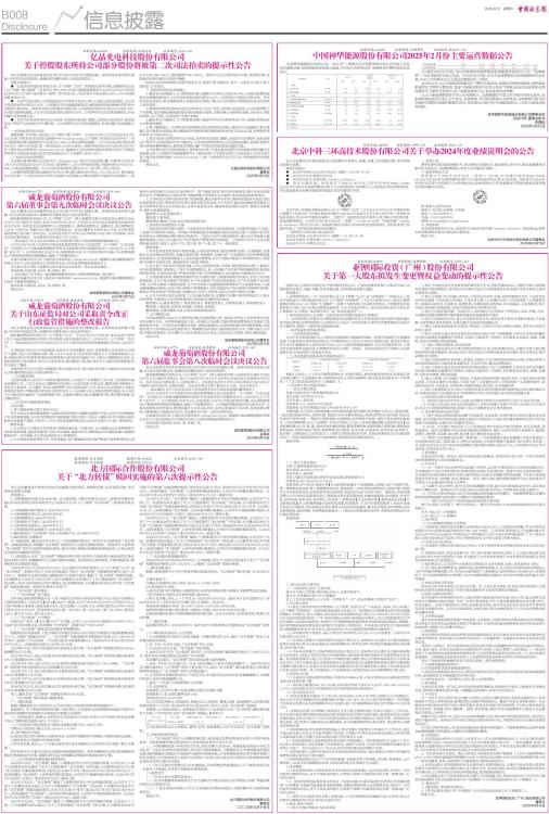 中国神华能源股份有限公司(“本公司”)董事会及全体董事保证本公告内容不存在任何虚假记载、误导性陈述或者重大遗漏,并对其内容的真实性、准确性和完整性承担法律责任。 ■ ■ 注:截至2025年2月底,本公司收购国家能源集团杭锦能源有限责任公司(“杭锦能源”)100%股权的交易已完成。自2025年2月起,本公司运营数据包含杭锦能源相关业务量,并对上年同期本公司主要运营数据进行了重述。 2025年2月,本公司煤炭销售量同比下降的主要原因,是煤炭采购需求偏弱;黄骅港装船量同比下降的主要原因,是受下游煤炭需求不足及大风天气影响;航运货运量及航运周转量同比下降的主要原因,是下游煤炭需求不足、航运业务结构调整。 以上主要运营数据来自本公司内部统计。运营数据在月度之间可能存在较大差异,其影响因素包括但不限于天气变化、设备检修、季节性因素和安全检查等。运营数据可能与相关期间定期报告披露的数据有差异。投资者应注意不恰当信赖或使用以上信息可能造成投资风险。 承中国神华能源股份有限公司董事会命 总会计师、董事会秘书 宋静刚 2025年3月15日