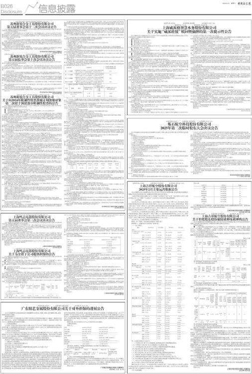 证券代码:603885 证券简称:吉祥航空 公告编号:临2025-018 上海吉祥航空股份有限公司 2025年2月主要运营数据公告 本公司董事会及全体董事保证本公告内容不存在任何虚假记载、误导性陈述或者重大遗漏,并对其内容的真实性、准确性和完整性承担法律责任。 上海吉祥航空股份有限公司(以下简称“吉祥航空”或“公司”)及所属子公司九元航空有限公司(以下简称“九元航空”)2025年2月份合并主要运营数据: (一)运营情况 2025年2月,公司客运运力投入(按可用座位公里计)同比下降2.74%,其中国内、国际和地区航线客运运力投入同比变动分别为-14.51%、46.13%和-9.66%;旅客周转量(按收入客公里计)同比下降4.83%,其中国内、国际和地区航线旅客周转量同比变动分别为-14.48%、39.71%和-6.82%;客座率为85.53%,同比下降1.87%,其中国内、国际和地区航线客座率同比变动分别为0.03%、-3.51%和2.59%。 2025年2月,公司国内客运运力投入(按可用座位公里计)较上月环比下降12.03%,国内旅客周转量(按收入客公里计)环比下降8.37%,国内航线客座率环比上升3.57%。国际客运运力投入(按可用座位公里计)较上月环比下降21.18%,国际旅客周转量(按收入客公里计)环比下降19.99%,国际航线客座率环比上升1.14%。 2025年2月,九元航空新增以下定期航线: 新增广州一朔州一哈尔滨往返航线(每周3班) 新增海口一成都天府往返航线(每周7班) (二)运力情况 ■ 注:上述相关指标含义如下: (一)可用吨公里:指飞行公里数乘以收费载运的可用收费载运吨位。 (二)可用座位公里:指飞行公里数乘以可出售座位数。 (三)可用货运吨公里:指飞行公里乘以可载货物及邮件吨位数量。 (四)收入吨公里:指飞行公里乘以收费运载吨位量。 (五)收入客公里:指飞行公里乘以收费旅客人数。 (六)收入货运吨公里:指飞行公里乘以收费运载货物及邮件吨位。 (七)客座率:指实际完成的收入客公里与可用座位公里之比。 (八)货物及邮件载运率:指收入货运吨公里与可用货运吨公里之比。 (九)综合载运率:指运输飞行所完成的运输总周转量与可提供吨公里之比。 (三)本月公司引进及退役的飞机型号和数量 本月公司及九元航空引进飞机2架,退役飞机0架。 截至2025年2月28日,公司运营93架A320系列飞机(其中27架为A321机型,22架为A320neo机型,14架为A321neo机型),9架波音787系列飞机。公司子公司九元航空实际运营27架飞机,均为波音737系列飞机。 (四)机队规模 单位:架 ■ 以上数据来自公司内部统计,可能与相关期间定期报告披露的数据有差异。投资者应注意不恰当信赖或使用以上信息可能造成投资风险。 特此公告。 上海吉祥航空股份有限公司董事会 2025年3月15日 证券代码:603885 证券简称:吉祥航空 公告编号:临2025-017 上海吉祥航空股份有限公司 关于控股股东股份解除质押及质押的公告 本公司董事会及全体董事保证本公告内容不存在任何虚假记载、误导性陈述或者重大遗漏,并对其内容的真实性、准确性和完整性承担法律责任。 重要内容提示: ● 上海吉祥航空股份有限公司(以下简称“公司”)控股股东上海均瑶(集团)有限公司(以下简称“均瑶集团”)持有公司股份1,020,862,080股,占公司股份总数的46.42%,均瑶集团累计质押公司股票(含本次)81,325万股,占其所持公司股份数的79.66%,占公司股份总数的36.98%。 公司于近日收到公司控股股东均瑶集团通知,获悉其将所持有公司的部分股份办理了解除质押及质押业务,具体事项如下: 一、本次股东股份解除质押基本情况: 单位:万股 ■ 注:若有尾差,则是因四舍五入所致。 二、本次股东股份质押基本情况: 单位:万股 ■ 注:若有尾差,则是因四舍五入所致。 上述质押股份不存在被用作重大资产重组业绩补偿等事项的担保或其他保障用途的情形。 三、股东累计质押股份情况 截至公告披露日,上述股东及其一致行动人累计质押股份情况如下: 单位:万股 ■ 注:若有尾差,则是因四舍五入所致。 四、控股股东及其一致行动人股份质押情况 截至本公告披露日,控股股东均瑶集团及其一致行动人合计质押股份数量占其合计所持公司股份数量比例超过50%。 1、均瑶集团未来半年内到期的质押股份数量为12,230万股,占均瑶集团所持公司股份的11.98%,占公司总股本的5.56%,对应融资余额为10.22亿元;未来一年内到期(含半年内到期)的质押股份数量为46,930万股,占均瑶集团所持公司股份的45.97%,占公司总股本的21.34%,对应融资余额为40.06亿元。 均瑶投资未来半年内到期的质押股份数量为0股;未来一年内到期(含半年内到期)的质押股份数量为2,750万股,占均瑶投资所持公司股份的76.25%,占公司总股本的1.25%,对应融资余额为2亿元。 截至本公告披露日,均瑶集团及均瑶投资资信状况良好,具备资金偿还能力,有足够的风险控制能力,未来还款来源主要包括营业收入、投资收益、股票分红等,质押风险在可控范围之内,目前不存在平仓风险。后续如出现平仓风险,均瑶集团及均瑶投资将采取包括但不限于补充质押、提前还款等措施应对。 2、控股股东及其一致行动人不存在通过非经营性资金占用、违规担保、关联交易等侵害公司利益的情况。 3、控股股东及其一致行动人质押事项对上市公司的影响: (1)控股股东及其一致行动人质押事项不会对上市公司的主营业务、融资授信及融资成本、持续经营能力产生影响; (2)控股股东及其一致行动人质