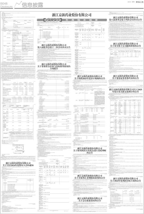 证券代码:002020 证券简称:京新药业 公告编号:2025014 一、重要提示 本年度报告摘要来自年度报告全文,为全面了解本公司的经营成果、财务状况及未来发展规划,投资者应当到证监会指定媒体仔细阅读年度报告全文。 所有董事均已出席了审议本报告的董事会会议。 非标准审计意见提示 □适用 √不适用 董事会审议的报告期利润分配预案或公积金转增股本预案 √适用 □不适用 是否以公积金转增股本 □是 √否 公司经本次董事会审议通过的利润分配预案为:以截止 2024 年 12 月 31 日公司总股本861,029,140 股扣除回购专户上已回购股份后的股本为基数,向全体股东每10股派发现金红利3.5元(含税),送红股0股(含税),不以公积金转增股本。 董事会决议通过的本报告期优先股利润分配预案 □适用 √不适用 二、公司基本情况 1、公司简介 ■ 2、报告期主要业务或产品简介 (一)主营业务情况 浙江京新药业股份有限公司(以下简称“公司)是一家通过国家GMP认证、欧盟(德国)GMP认证、ISO14001认证和美国FDA现场认证并拥有自营进出口权的国家重点高新技术企业,主要从事化学制剂、传统中药、生物制剂、化学原料药、医疗器械的研发、生产及销售。 报告期内,公司产品结构持续优化,主营业务盈利能力稳定增长。主要产品种类如下: ■ (二)公司市场地位 公司以“精心守护健康”为使命,坚持“务实、创新、包容、共赢”的核心价值观,致力于成为中国精神神经、心脑血管领域的领先者,公司是第一批“中国医药企业制剂国际化先导企业”,连续多年荣登“中国化学制药行业制剂出口型优秀企业品牌”、“中国医药工业百强”和“中国化学制药企业百强榜”。 公司在CNS领域的产品力持续加强,治疗失眠的1类创新药京诺宁?(地达西尼胶囊)于2023年12月份获得注册批件,2024年3月底正式上市销售,2024年11月顺利通过医保谈判,进入医保支付目录。该品种采用了部分激动的全球首创机制,更好地平衡了失眠治疗的疗效和安全性,具有“昼舒夜宁”的显著治疗效果优势,为失眠领域的医生和患者带来新的治疗手段。抗癫痫药物吉易克?(左乙拉西坦片)、治疗帕金森药物索普乐?(普拉克索片及缓释片)和抗抑郁药物唯他停?(盐酸舍曲林片及分散片)等药品在院内市场排名前列。全资子公司绍兴京新是全球喹诺酮类抗感染原料药的主要生产企业之一,其主要产品左氧氟沙星和环丙沙星的产量和市场份额位居全球前列;全资子公司深圳巨烽在国内医疗影像显示终端的市场占有率较高,是全球主流大设备厂商的战略合作伙伴。 (三)报告期主要经营成果 2024年,中国医药行业迎来进一步的深度改革。有关部门以深化和完善集中带量采购为龙头,以继续治理医药价格为抓手,以大力鼓励创新为契机,正在重塑中国的医药产业。旧有的医药经营模式正在被升级和替代,新的经营机制初现端倪。面对改革带来的前所未有的机遇和挑战,公司凭借多年积累的经营底蕴,充分发挥经营韧性,借助逐步深化的营销模式调整,大力拓展院内集采市场、基层市场、院外市场和海外市场,积极应对仿制药品种价格波动影响,在进一步扩大主要经营品种市场份额的前提下,继续保持了营业收入和利润的稳定增长。 报告期内,公司继续以“做强药品主业,发展医疗器械”为经营方针,深化精益生产体系建设,深化营销体系升级,持续增强研发能力,坚持以精神神经领域为主体,同时统筹推进心脑血管和消化领域协同发展。全年实现营业收入41.59亿元,同比增长3.99%;其中成品药收入25.22亿元,同比增长8.42%;原料药收入8.76亿元,同比下降8.37%;医疗器械收入6.87亿元,同比增长7.84%,主营业务保持了平稳增长。全年实现归母净利润7.12亿元,同比增长15.04%;实现扣非净利润6.47亿元,同比增长21.38%,盈利能力有所提升。 1类创新药地达西尼胶囊于2024年3月底正式上市销售。公司围绕地达西尼胶囊确定了医保谈判、推广入院以及学术推广三大任务。在2024年11月份结束的创新药医保谈判中,地达西尼胶囊成功进入医保支付目录,为该品种后续销售提供了准入支持。2024年度,公司自营团队以及核心代理商成功完成了近600家医院的入院程序,初步覆盖了重点销售地区。公司协同核心代理商在快速推进入院的同时,大力开展地达西尼胶囊学术推广活动,报告期内共举办各级各类活动160多场。上述进展为推动地达西尼胶囊进入医保支付目录之后的普及使用奠定了基础,为公司构建创新药商业化能力迈出了坚实一步。 2024年,公司研发投入3.83亿元,坚定创新布局。1类创新药一一治疗精神分裂症的JX11502MA胶囊临床试验获得一定进展,II期临床接近尾声。另外,治疗溃疡性结肠炎的改良型新药康复新肠溶胶囊II期临床也进展顺利。除了上述品种之外,一款治疗LP(a)血症的1类创新药JX2201胶囊在报告期内顺利提交临床申请,并于近期取得临床批件,启动I期临床试验。 除了布局创新药,仿制药的开发也在提速。报告期内,获得14个仿制药生产批件。另外,治疗精神分裂症的盐酸卡利拉嗪胶囊完成III期临床试验,将于近期正式提交上市申请。另外一款重点品种一一治疗高胆固醇血症的盐酸考来维仑片的III临床试验也按照工作计划顺利进行。 在不断拓展创新药管线的同时,继续保持仿制药业务的稳健经营。公司发挥仿制药业务的经营韧性,充分利用集采品种放量带来的销量增