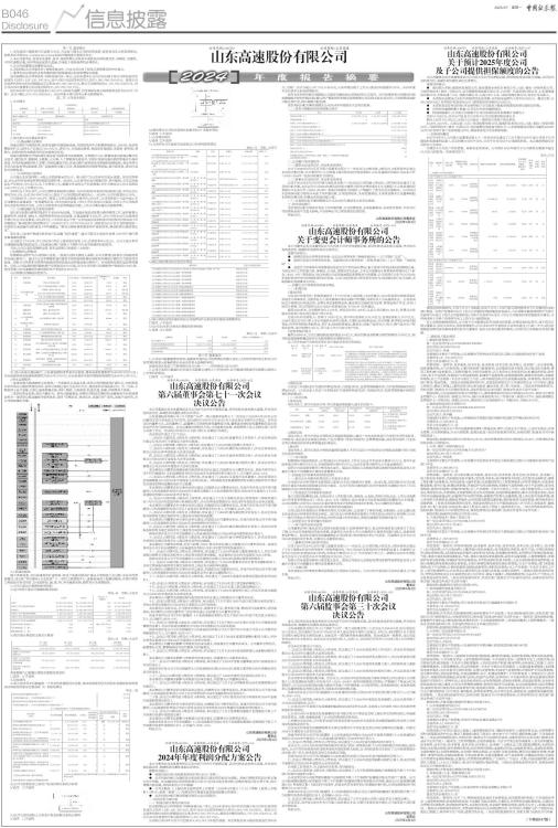 第一节 重要提示 1、本年度报告摘要来自年度报告全文,为全面了解本公司的经营成果、财务状况及未来发展规划,投资者应当到http://www.sse.com.cn网站仔细阅读年度报告全文。 2、本公司董事会、监事会及董事、监事、高级管理人员保证年度报告内容的真实性、准确性、完整性,不存在虚假记载、误导性陈述或重大遗漏,并承担个别和连带的法律责任。 3、公司全体董事出席董事会会议。 4、天职国际会计师事务所(特殊普通合伙)为本公司出具了标准无保留意见的审计报告。 5、董事会决议通过的本报告期利润分配预案或公积金转增股本预案 经天职国际会计师事务所(特殊普通合伙)审计,2024年度本公司合并后归属于母公司所有者的净利润为人民币3,196,128,356.19元,其中:母公司实现净利润为人民币3,085,099,658.50元。按母公司实现净利润10%的比例提取法定公积金308,509,965.85元,剩余未分配利润为2,776,589,692.65元。母公司2024年度累积可供分配利润为15,241,058,561.79元。 拟以2024年12月31日总股本4,852,081,025股为基数,向全体股东每10股派发现金红利4.20元(含税),共计分配2,037,874,030.50元。2024年度不进行资本公积金转增股本。 第二节 公司基本情况 1、公司简介 ■ ■ 2、报告期公司主要业务简介 (一)公路运输行业情况 高速公路作为连接区域、促进流通的关键基础设施,在国民经济中占据着重要地位。2024年,经济规模稳步扩大,国内生产总值达134.9万亿元,增长5%。从发展态势看,我国经济基础稳、优势多、韧性强、潜能大,长期向好的支撑条件和基本趋势没有变。 高速公路智能化升级和绿色建设是当前的技术发展趋势。在智能化方面,智慧高速公路通过整合信息技术、通信技术、物联网、大数据、云计算、人工智能等先进技术,实现对传统高速公路的智能化升级和改造,为经济发展提供有力支撑。在绿色建设方面,高速公路行业将更加注重绿色低碳发展。通过采用分布式光伏发电等绿色能源、推广绿色建筑与施工方法、提高能源利用效率等措施,减少碳排放,推动行业的可持续发展。 (二)公司所处行业地位 公司是山东区域内唯一A股上市的路桥运营公司,核心路产为山东省内交通大通道,区位优势明显,对山东经济发展发挥着较强的支撑作用。2024年,山东省经济运行稳健向好、进中提质,全年实现地区生产总值98,565.8亿元,比上年增长5.7%,跑赢全年国内生产总值增速;全年全省居民人均可支配收入42,077元,比上年增长5.5%。 在同行业上市公司中,公司主要财务指标排名靠前。2020年发布5年股东回报规划以来,平均分红比例约为69.15%,分红共计约97.54亿元,彰显了公司回馈投资者的决心。2024年,公司市值增长55.38%。 公司连续5年(2019-2023年)获得上交所信息披露A级评价;2024年,公司荣获第十九届中国上市公司董事会金圆桌奖一优秀董事会奖、中国百强企业奖、中国上市公司ESG百强奖、中国上市公司投资者关系股东回报天马奖、上市公司投资者关系管理最佳实践、上市公司董办最佳实践案例等。 (三)公路运输行业主要相关政策 现行的《收费公路管理条例》于2004年起实施。为加强并规范对收费公路的管理工作,保护收费公路使用者、投资者、债权人、经营管理者的合法权益等,交通运输部于2013年、2015年和2018年对条例进行修订并公开征求意见。2024年7月,《中共中央关于进一步全面深化改革推进中国式现代化的决定》中明确提出“推动收费公路政策优化”;2024年12月,《中共中央办公厅、国务院办公厅关于加快建设统一开放的交通运输市场的意见》中明确提出“推进公路收费制度和养护体制改革,推动收费公路政策优化”。 多年来,山东省严格落实鲜活农产品运输“绿色通道”、重大节假日小型客车免费、ETC用户通行费优惠等惠民政策。 公司成立于1999年,并于2002年3月在上海证券交易所上市,注册资本48.52亿元。公司主要从事对交通基础设施的投资运营、以及高速公路产业链上下游相关行业等领域的股权投资。 目前,公司主要经营路桥运营、资本运营和工程建设三大板块: 1.收费路桥运营板块 收费路桥运营作为公司的核心业务,一直是公司的主要收入来源。公司主要通过收购方式获取经营性高速公路资产,通过为过往车辆提供通行服务并按照政府收费标准收取车辆通行费的方式获取经营收益。同时公司凭借相关管理经验受托管理其他企业所属高速公路资产,为其提供优质的运营管理服务。目前,公司运营管理的路桥资产总里程约2913公里,其中公司所辖自有路桥资产里程约1604公里、受托管理山东高速集团所属的路桥资产里程约1309公里。 公司所辖自有路段信息如下: ■ 注:经山东省交通运输厅、山东省发展和改革委员会批准,潍莱高速收费期限为2024年10月18日;京台高速济青连接线收费期限为2025年1月18日,京台高速齐河至济南段收费期限为2025年12月31日。 2.资本运营板块 一是坚持做大做强路桥主业理念,一方面稳住主业基本盘,省内以现有路段改扩建为主,同时积极开拓市场化公路投资建设项目,省外以收购已通车主业项目为主,建设省外区域发展平台。另一方面,不断延伸主业产业链,目前已涵盖智慧交通、养护、物流、工程咨询、轨道交通、金融、环保等多个领域。 二是依托资金优势,深化产融结合。依托由畅赢基金、保理公司构成的集科技金融服务平台和保理业务为一体