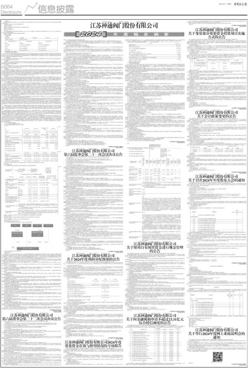证券代码:002438 证券简称:江苏神通 公告编号:2025-011 江苏神通阀门股份有限公司 一、重要提示 本年度报告摘要来自年度报告全文,为全面了解本公司的经营成果、财务状况及未来发展规划,投资者应当到证监会指定媒体仔细阅读年度报告全文。 所有董事均已出席了审议本报告的董事会会议。 非标准审计意见提示 □适用 √不适用 董事会审议的报告期利润分配预案或公积金转增股本预案 √适用 □不适用 是否以公积金转增股本 □是 √否 公司经本次董事会审议通过的利润分配预案为:以507,537,461为基数,向全体股东每10股派发现金红利1.75元(含税),送红股0股(含税),不以公积金转增股本。 董事会决议通过的本报告期优先股利润分配预案 □适用 □不适用 二、公司基本情况 1、公司简介 ■ 2、报告期主要业务或产品简介 (一)主要业务、主要产品及用途 报告期内,公司主要从事应用于冶金领域的高炉煤气全干法除尘系统、转炉煤气除尘与回收系统、焦炉烟气除尘系统、煤气管网系统的特种阀门、法兰,应用于核电站的核级蝶阀和球阀、核级法兰和锻件、非核级蝶阀和球阀及其配套设备,应用于核化工领域的专用阀门及装备,以及应用于石油石化、煤化工、超(超)临界火电、LNG超低温阀门和法兰及锻件的研发、生产和销售。同时,通过子公司瑞帆节能开展高炉、转炉干法除尘系统总包及合同能源管理项目投资业务。 (二)经营模式 公司凭借多年来的经营管理经验,结合产品特点和业务发展需求,采取的采购、生产、销售模式符合行业特点,满足公司业务发展需要。报告期内,公司经营模式未发生重大变化。 1、采购模式 公司采用“以产定购”和“适当储备”相结合的采购模式。公司建立了稳定的采购渠道、完善的供应商管理体系和质量管理体系,公司实行合格供应商评定制度和招投标制度,建立了公平、公正、合理的供应商评价体系,定期对供应商进行遴选和考核评价,并根据考核评价结果对供应商实施优胜劣汰的动态管理。 2、生产模式 公司生产经营模式主要为“以销定产”的模式,生产经营活动围绕客户订单展开,每年定期与主要客户洽谈产品供需计划。公司充分利用自身力量和社会资源,实现“毛坯零部件、粗加工等部分委外,产品研发、装配检测、质量控制和营销管理以自主控制为主”的经营模式,掌握核心技术和工艺,实现共创、共赢、共享的目标。 3、销售模式 公司主要采取直销的模式,主要通过参与客户的招投标等方式获取订单,公司在销售过程中重点突出技术领先、性价比好、服务优良的综合优势,及时跟进行业发展趋势,适时推出新产品以及老产品改进以满足客户需求。公司主要通过市场开发团队,在公共媒介或市场渠道上获得公开招标信息,或通过原有客户推荐获得招标邀请,获得招标信息后,公司市场团队组织经营管理、专业技术和营销团队等方面的人员进行实地考察、调研和评估分析,为解决用户对阀门应用方面的难题和阀门全生命周期服务提供解决方案,并制定相应的投标策略和风险控制措施。随着互联网技术和信息化的不断发展,客户通过网络进行线上招投标的比例大幅增加,企业经营规模、生产能力、品牌影响力、竞争实力等为主要评价标准,而公司作为上市公司和行业著名品牌受到了用户的广泛认可。 4、服务模式 公司致力于与客户建立长期稳定的合作关系,通过技术交流、互访调研、合作研发等方式,与客户保持了互利互惠的良好合作关系。公司执行严格的质量和技术标准,采取严密的质量管控措施,保证质保体系持续、稳定、有效运行,在产品生产、品控、运输、交付等环节层层把关,提升产品品质和服务质量,为客户提供高品质的产品和热情周到的服务。为了满足各类客户的个性化需求,公司通过市场调研、市场细分及阀门管家信息化平台,了解顾客的偏好和需求愿望;除通过电话、电子邮件、传真等方式与客户保持经常沟通外,公司还组织营销和技术人员定期拜访客户,现场给予客户技术支持,提供优质的售前、售中及售后服务,提高客户满意度,塑造良好的品牌形象。 (三)公司所处的市场地位 公司是中国通用机械工业协会阀门分会的理事长单位,是国内首批进军核电领域的阀门企业之一,在核电阀门产品领域,自2008年以来,公司已成为我国核电阀门的主要供应商,在已建设核电工程的招标中公司研制的各类核电阀门、装备等产品具有显著领先的竞争优势,至今已有超15万台各类核电阀门产品在线使用。公司紧跟国内核电技术进步,持续投入人力、物力、财力致力于核电专用阀门及系统装备的研制和开发,研发了满足第三代、第四代核电技术要求的阀门产品,覆盖AP1000、华龙一号、CAP1400、快堆及高温气冷堆等主力堆型,并在既有优势产品基础上,进一步拓展产品品类,已具备核级蝶阀、球阀、闸阀、截止阀、调节阀、隔膜阀、仪表阀、地坑过滤器等产品的供货能力。近年来我国陆续核准建设核电机组包括漳州核电1-2号机组、太平岭核电1-2号机组、昌江核电3-4号机组、三澳核电1-2号机组等,核电新机组批准建设逐渐进入常态化,在“确保安全的前提下积极有序发展核电”的政策引领下,公司核电阀门业务将面临较大发展机会。随着公司的经营规模不断扩大,特别是涉及核电业务的不断拓展,公司坚持走“专精特新”高质