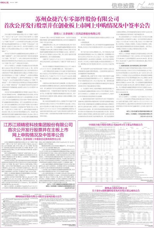 特别提示 苏州众捷汽车零部件股份有限公司(以下简称“众捷汽车”、“发行人”或“公司”)首次公开发行股票(以下简称“本次发行”)并在创业板上市的申请已经深圳证券交易所(以下简称“深交所”)上市审核委员会审议通过,并已经获得中国证券监督管理委员会(以下简称“中国证监会”)同意注册(证监许可〔2025〕309号)。本次发行的保荐人(主承销商)为天风证券股份有限公司(以下简称“保荐人(主承销商)”)。 本次发行采用向参与战略配售的投资者定向配售(以下简称“战略配售”)、网下向符合条件的网下投资者询价配售(以下简称“网下发行”)与网上向持有深圳市场非限售A股股份和非限售存托凭证市值的社会公众投资者定价发行(以下简称“网上发行”)相结合的方式进行。 发行人与保荐人(主承销商)协商确定本次发行股份数量为3,040.00万股,发行价格为人民币16.50元/股。本次发行的发行价格不超过剔除最高报价后网下投资者报价的中位数和加权平均数,剔除最高报价后通过公开募集方式设立的证券投资基金(以下简称“公募基金”)、全国社会保障基金(以下简称“社保基金”)、基本养老保险基金(以下简称“养老金”)、企业年金基金和职业年金基金(以下简称“年金基金”)、符合《保险资金运用管理办法》等规定的保险资金(以下简称“保险资金”)和合格境外投资者资金报价中位数和加权平均数孰低值,故保荐人相关子公司无需参与本次战略配售。 本次发行的初始战略配售的发行数量为608.00万股,占本次发行数量的20.00%。根据最终确定的发行价格,本次发行的参与战略配售的投资者由发行人的高级管理人员与核心员工参与本次战略配售设立的专项资产管理计划和其他参与战略配售的投资者组成。发行人的高级管理人员与核心员工参与本次战略配售设立的专项资产管理计划为华泰众捷汽车家园1号创业板员工持股集合资产管理计划(以下简称“众捷汽车员工资管计划”),最终获配股份数量为254.5454万股,约占本次发行股份数量的8.37%。其他参与战略配售的投资者最终战略配售股份数量为353.4546万股,约占本次发行股份数量的11.63%。本次发行最终战略配售数量为608.00万股,占本次发行数量的20.00%。本次发行初始战略配售数量与最终战略配售数量相同,本次发行战略配售未向网下发行进行回拨。 战略配售回拨后、网上网下回拨机制启动前,网下发行数量为1,702.40万股,约占扣除最终战略配售数量后本次发行数量的70.00%;网上初始发行数量为729.60万股,约占扣除最终战略配售数量后本次发行数量的30.00%。最终网下、网上发行合计数量为2,432.00万股,网上及网下最终发行数量将根据网上、网下回拨情况确定。 众捷汽车于2025年4月15日(T日)利用深圳证券交易所交易系统网上定价初始发行“众捷汽车”股票729.60万股。 本次发行的缴款环节敬请投资者重点关注,并于2025年4月17日(T+2日)及时履行缴款义务。具体内容如下: 1、网下获配投资者应根据《苏州众捷汽车零部件股份有限公司首次公开发行股票并在创业板上市网下发行初步配售结果公告》,于2025年4月17日(T+2日)16:00前,按最终确定的发行价格与获配数量,及时足额缴纳新股认购资金。 认购资金应该在规定时间内足额到账,未在规定时间内或未按要求足额缴纳认购资金的,该配售对象获配新股全部无效。多只新股同日发行时出现前述情形的,该配售对象全部获配股份无效。不同配售对象共用银行账户的,若认购资金不足,共用银行账户的配售对象获配股份全部无效。网下投资者如同日获配多只新股,请按每只新股分别缴款,并按照规范填写备注。 网上投资者申购新股中签后,应根据《苏州众捷汽车零部件股份有限公司首次公开发行股票并在创业板上市网上摇号中签结果公告》履行资金交收义务,确保其资金账户在2025年4月17日(T+2日)日终有足额的新股认购资金,不足部分视为放弃认购,由此产生的后果及相关法律责任由投资者自行承担。投资者款项划付需遵守投资者所在证券公司的相关规定。 网下和网上投资者放弃认购部分的股份由保荐人(主承销商)包销。 2、限售期安排 本次发行的股票中,网上发行的股票无流通限制及限售期安排,自本次公开发行的股票在深交所上市之日起即可流通。 网下发行部分采用比例限售方式,网下投资者应当承诺其获配股票数量的10%(向上取整计算)限售期限为自发行人首次公开发行并上市之日起6个月,即每个配售对象获配的股票中,90%的股份无限售期,自本次发行股票在深交所上市交易之日起即可流通;10%的股份限售期为6个月,限售期自本次发行股票在深交所上市交易之日起开始计算。 网下投资者参与初步询价报价及网下申购时,无需为其管理的配售对象填写限售期安排,一旦报价即视为接受本公告所披露的网下限售期安排。 战略配售方面,众捷汽车员工资管计划和其他参与战略配售的投资者获配股票限售期为12个月。限售期自本次公开发行的股票在深交所上市之日起开始计算。限售期届满后,参与战略配售的投资者对获配股份的减持适用中国证监会和深交所关于股份减持的有关规定。 3、当出现网下和网上投资者缴款认购的股份数量合计不足扣除最终战略配售数量后本次公开发行数量的70%时,发行人和保荐人(主承销商)将中止本次新股发行,并就中止发行的原