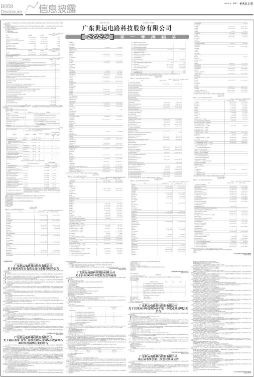 证券代码:603920 证券简称:世运电路 本公司董事会及全体董事保证本公告内容不存在任何虚假记载、误导性陈述或者重大遗漏,并对其内容的真实性、准确性和完整性承担法律责任。 重要内容提示 公司董事会、监事会及董事、监事、高级管理人员保证季度报告内容的真实、准确、完整,不存在虚假记载、误导性陈述或重大遗漏,并承担个别和连带的法律责任。 公司负责人、主管会计工作负责人及会计机构负责人(会计主管人员)保证季度报告中财务信息的真实、准确、完整。 第一季度财务报表是否经审计 □是 √否 一、主要财务数据 (一)主要会计数据和财务指标 单位:元 币种:人民币 ■ (二)非经常性损益项目和金额 √适用 □不适用 单位:元 币种:人民币 ■ 对公司将《公开发行证券的公司信息披露解释性公告第1号一一非经常性损益》未列举的项目认定为非经常性损益项目且金额重大的,以及将《公开发行证券的公司信息披露解释性公告第1号一一非经常性损益》中列举的非经常性损益项目界定为经常性损益的项目,应说明原因。 □适用 √不适用 (三)主要会计数据、财务指标发生变动的情况、原因 √适用 □不适用 ■ 二、股东信息 (一)普通股股东总数和表决权恢复的优先股股东数量及前十名股东持股情况表 单位:股 ■ 持股5%以上股东、前10名股东及前10名无限售流通股股东参与转融通业务出借股份情况 □适用 √不适用 前10名股东及前10名无限售流通股股东因转融通出借/归还原因导致较上期发生变化 □适用 √不适用 三、其他提醒事项 需提醒投资者关注的关于公司报告期经营情况的其他重要信息 □适用 √不适用 四、季度财务报表 (一)审计意见类型 □适用 √不适用 (二)财务报表 合并资产负债表 2025年3月31日 编制单位:广东世运电路科技股份有限公司 单位:元 币种:人民币 审计类型:未经审计 ■ ■ 公司负责人:林育成主管会计工作负责人:蒋毅会计机构负责人:黄华明 合并利润表 2025年1一3月 编制单位:广东世运电路科技股份有限公司 单位:元 币种:人民币 审计类型:未经审计 ■ ■ 本期发生同一控制下企业合并的,被合并方在合并前实现的净利润为:0元,上期被合并方实现的净利润为:0 元。 公司负责人:林育成主管会计工作负责人:蒋毅会计机构负责人:黄华明 合并现金流量表 2025年1一3月 编制单位:广东世运电路科技股份有限公司 单位:元 币种:人民币 审计类型:未经审计 ■ 公司负责人:林育成主管会计工作负责人:蒋毅会计机构负责人:黄华明 母公司资产负债表 2025年3月31日 编制单位:广东世运电路科技股份有限公司 单位:元 币种:人民币 审计类型:未经审计 ■ ■ 公司负责人:林育成主管会计工作负责人:蒋毅会计机构负责人:黄华明 母公司利润表 2025年1一3月 编制单位:广东世运电路科技股份有限公司 单位:元 币种:人民币 审计类型:未经审计 ■ 公司负责人:林育成主管会计工作负责人:蒋毅会计机构负责人:黄华明 母公司现金流量表 2025年1一3月 编制单位:广东世运电路科技股份有限公司 单位:元 币种:人民币 审计类型:未经审计 ■ 公司负责人:林育成主管会计工作负责人:蒋毅会计机构负责人:黄华明 (三)2025年起首次执行新会计准则或准则解释等涉及调整首次执行当年年初的财务报表 □适用 √不适用 特此公告 广东世运电路科技股份有限公司董事会 2025年4月15日