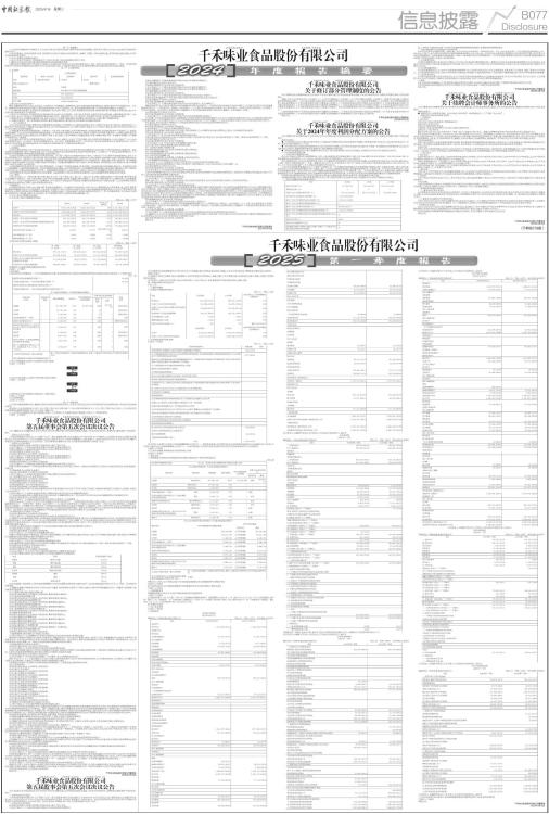 证券代码:603027 证券简称:千禾味业 千禾味业食品股份有限公司 本公司董事会及全体董事保证本公告内容不存在任何虚假记载、误导性陈述或者重大遗漏,并对其内容的真实性、准确性和完整性承担法律责任。 重要内容提示 公司董事会、监事会及董事、监事、高级管理人员保证季度报告内容的真实、准确、完整,不存在虚假记载、误导性陈述或重大遗漏,并承担个别和连带的法律责任。 公司负责人、主管会计工作负责人及会计机构负责人(会计主管人员)保证季度报告中财务信息的真实、准确、完整。 第一季度财务报表是否经审计 □是 √否 一、主要财务数据 (一)主要会计数据和财务指标 单位:元 币种:人民币 ■ (二)非经常性损益项目和金额 √适用 □不适用 单位:元 币种:人民币 ■ 对公司将《公开发行证券的公司信息披露解释性公告第1号一一非经常性损益》未列举的项目认定为非经常性损益项目且金额重大的,以及将《公开发行证券的公司信息披露解释性公告第1号一一非经常性损益》中列举的非经常性损益项目界定为经常性损益的项目,应说明原因。 □适用 √不适用 (三)主要会计数据、财务指标发生变动的情况、原因 □适用 √不适用 二、股东信息 (一)普通股股东总数和表决权恢复的优先股股东数量及前十名股东持股情况表 单位:股 ■ 持股5%以上股东、前10名股东及前10名无限售流通股股东参与转融通业务出借股份情况 □适用 √不适用 前10名股东及前10名无限售流通股股东因转融通出借/归还原因导致较上期发生变化 □适用 √不适用 三、其他提醒事项 需提醒投资者关注的关于公司报告期经营情况的其他重要信息 √适用 □不适用 公司投资总额为 12.6 亿元的“ 年产 60 万吨调味品智能制造项目” 建设周期为 2020 年 1 月-2024 年 12 月,共计 5 年,分两期建设,其中第一期年产 20 万吨酱油、 10 万吨料酒生产线建设已于 2023 年 2 月底竣工转固投入使用;第二期将完成年产 30 万吨酱油生产线建设。截止 2025 年3 月 31 日,该项目累计投入128,024.03 万元。 四、季度财务报表 (一)审计意见类型 □适用 √不适用 (二)财务报表 合并资产负债表 2025年3月31日 编制单位:千禾味业食品股份有限公司单位:元 币种:人民币 审计类型:未经审计 ■■ 公司负责人:伍超群主管会计工作负责人:何天奎会计机构负责人:赵世方 合并利润表 2025年1一3月 编制单位:千禾味业食品股份有限公司单位:元 币种:人民币 审计类型:未经审计 ■ 本期发生同一控制下企业合并的,被合并方在合并前实现的净利润为:0元,上期被合并方实现的净利润为:0 元。 公司负责人:伍超群主管会计工作负责人:何天奎会计机构负责人:赵世方 合并现金流量表 2025年1一3月 编制单位:千禾味业食品股份有限公司单位:元 币种:人民币 审计类型:未经审计 ■ 公司负责人:伍超群主管会计工作负责人:何天奎会计机构负责人:赵世方 母公司资产负债表 2025年3月31日 编制单位:千禾味业食品股份有限公司单位:元 币种:人民币 审计类型:未经审计 ■ 公司负责人:伍超群主管会计工作负责人:何天奎会计机构负责人:赵世方 母公司利润表 2025年1一3月 编制单位:千禾味业食品股份有限公司单位:元 币种:人民币 审计类型:未经审计 ■ 公司负责人:伍超群主管会计工作负责人:何天奎会计机构负责人:赵世方 母公司现金流量表 2025年1一3月 编制单位:千禾味业食品股份有限公司单位:元 币种:人民币 审计类型:未经审计 ■ 公司负责人:伍超群主管会计工作负责人:何天奎会计机构负责人:赵世方 (三)2025年起首次执行新会计准则或准则解释等涉及调整首次执行当年年初的财务报表 □适用 √不适用 特此公告。 千禾味业食品股份有限公司董事会 2025年4月15日