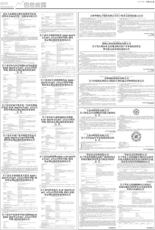 公告送出日期:2025年4月16日 一、公募REITs 基本信息 ■ 注:1、本基金本次收益分配方案已经基金托管人复核。 2、根据本基金基金合同约定,在符合有关基金分配条件的前提下,本基金应当将90%以上合并后基金年度可供分配金额以现金形式分配给投资者。基础设施基金的收益分配在符合分配条件的情况下每年不得少于1次。本次拟分配金额为人民币14,178,000.00元,占截止本次收益分配基准日可供分配金额的99.9937%。本基金合并后2024年度可供分配金额为57,141,498.56元,本次分红实施后,本基金2024年度收益分配符合基金合同约定。 截止基准日公募REITs按照本次分红比例计算的应分配金额与实际分配金额间可能存在尾差,具体以注册登记机构的规则为准。 二、与分红相关的其他信息 ■ 注:1、本基金的分配方式为现金分红。 2、现金红利款将于2025年4月22日自本基金托管账户划出。 三、其他需要提示的事项 (1)权益分派期间(2025年4月16日至2025年4月18日)暂停跨系统转托管业务。 (2)根据《深圳证券交易所证券投资基金上市规则》,本基金于本收益分配公告披露当日上午开市起停牌一小时,上午十点三十分复牌。同时,根据《深圳证券交易所证券投资基金业务指引第3号一一基金通平台份额转让》,本基金于本收益分配公告披露当日上午开市起暂停基金通平台份额转让业务一小时,于当日上午十点三十分起恢复基金通平台份额转让业务。 (3)本基金可供分配金额是在合并净利润基础上进行合理调整后的金额。基金管理人计算年度可供分配金额过程中,应当先将合并净利润调整为税息折旧及摊销前利润(EBITDA),并在此基础上综合考虑项目公司持续发展、项目公司偿债能力、经营现金流等因素后确定可供分配金额计算调整项。本基金可供分配金额计算调整项如下: 基础设施基金发行份额募集的资金;收购基础设施项目所支付的现金净额,包括收购基础设施项目所支付的对价抵减收购日取得的项目公司货币资金;期初现金余额;金融资产相关调整;应收、应付项目的变动;当期资本性支出;当期支付的利息及所得税费用;偿还借款支付的本金以及对未来合理的相关支出预留,包括重大资本性支出、预留不可预见费用、期末负债。 经过上述项目调整后,本基金自2024年10月1日至本次收益分配基准日(2024年12月31日)可供分配金额为14,175,142.56元。 本基金截止本次收益分配基准日的可供分配金额14,178,898.28元,包含前期未分配的可供分配金额3,755.72元,以及2024年10月1日至2024年12月31日的可供分配金额14,175,142.56元。 (4)权益登记日当天买入的基金份额享有本次分红权益,权益登记日当天卖出的基金份额不享有本次分红权益。 四、相关机构联系方式 投资者可登录本公司网站(www.ChinaAMC.com)或拨打本公司客户服务电话(400-818-6666)咨询、了解本次分红相关事宜。 五、风险提示 基金管理人承诺以诚实信用、勤勉尽责的原则管理和运用基金资产,但不保证本基金一定盈利,也不保证最低收益。本基金的过往业绩及其净值高低并不预示其未来业绩表现。因基金分红导致基金资产净值的变化,不会改变基金的风险收益特征,不会降低基金投资风险或提高基金投资收益。基金管理人提醒投资者基金投资的“买者自负”原则,在做出投资决策后,基金运营状况与基金净值变化引致的投资风险,由投资者自行负担。投资者在参与本基金相关业务前,应当认真阅读本基金基金合同、招募说明书、基金产品资料概要等信息披露文件,熟悉基础设施基金相关规则,自主判断基金投资价值,自主做出投资决策,自行承担投资风险,全面认识本基金的风险收益特征和产品特性,并根据自身的投资目的、投资期限、投资经验、资产状况等判断基金是否和自身风险承受能力相适应,理性判断市场,谨慎做出投资决策。本基金风险揭示详见本基金招募说明书及其更新。 特此公告 华夏基金管理有限公司 二〇二五年四月十六日 华夏基金管理有限公司 关于华夏上证科创板生物医药交易型开放式指数证券投资基金新增中信建投证券为发售代理机构的公告 根据华夏上证科创板生物医药交易型开放式指数证券投资基金(基金简称:华夏上证科创板生物医药ETF,场内简称:科创药,扩位简称:科创医药ETF基金,基金代码:588130,以下简称“本基金”)招募说明书、基金份额发售公告等规定,本基金自2025年4月7日起至2025年4月18日(含)进行发售。目前投资者可选择网上现金认购、网下现金认购、网下股票认购3种方式认购本基金,办理网上现金认购、网下现金认购及网下股票认购的日期均为2025年4月7日起至2025年4月18日(含当日)。本基金网上现金认购和网下现金认购的合计首次募集规模上限为人民币75亿元(不含募集期利息),采取“全程比例确认”的方式对上述规模限制进行控制。网下股票认购的首次募集规模上限为人民币5亿元。 自2025年4月16日起,投资者可在以下销售机构办理本基金的网下股票认购业务,具体如下: ■ 具体业务办理以各销售机构的规定为准。销售机构的业务办理状况亦请遵循其各自规定执行。本基金的网下发售代理机构已在本公司官网(www.ChinaAMC.com)公示,投资者可登录查询,网上现金发售代理机构为具有基金代销业务资格的上海证券交易所会员单位,具体名单可在上海证券交易所网站查询。投资者可登录本公司网站或拨打本公